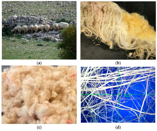 (a) Sheep on island Krk; (b) sheep wool before treatment with seawater; (c) sheep wool after treatment with seawater; (d) sheep wool fibers under an optical microscope.