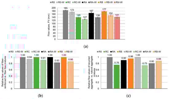 The results of the consistency testing of fresh mortars, expressed as flow values (FV), are shown in Figure 5a as absolute values (mean FV of two tests) and in Figure 5b,c as relative values with respect to fiber-free mortars (R0, RC, RA, and RB) and NA mortars (R0 and R0-W). Figure 5a also presents the standard deviation of the measurements. ANOVA confirmed statistically significant differences between mortars (F = 15.42, p < 0.001), with mortar composition accounting for a large proportion of the observed variance (η2 ≈ 0.93).