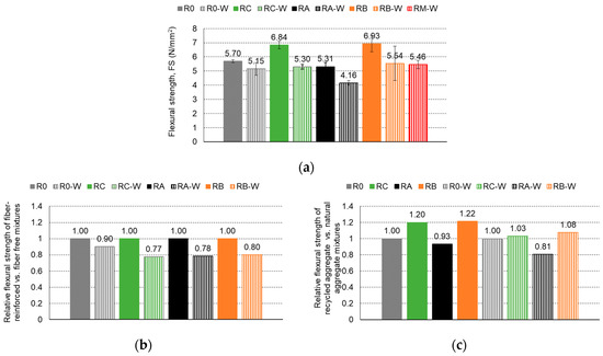 The results of the flexural strength (FS) testing of mortar specimens are shown in Figure 6a as absolute values (mean FS of three specimens) and in Figure 6b,c as relative values with respect to fiber-free mortars (R0, RC, RA, and RB) and natural aggregate mortars (R0 and R0-W). Figure 6a also presents the standard deviation of the measurements. ANOVA confirmed statistically significant differences in peak flexural strength between mortars (F = 8.59, p < 0.001), with mortar composition accounting for a large proportion of the observed variance (η2 ≈ 0.79).