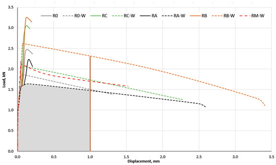 where b is the specimen width (m) and h is the specimen height (m). The displacement limit of 1 × 10−3 m, indicated as a vertical line in Figure 7, was defined in accordance with [63], where similar natural fiber micro-reinforced unnotched prisms were analyzed.
