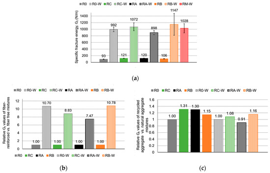 The results are shown in Figure 8a as absolute values (mean Gf of three specimens) and in Figure 8b,c as relative values with respect to fiber-free mortars (R0, RC, RA, and RB) and natural aggregate mortars (R0 and R0-W). Figure 8a also presents the standard deviation of the measurements. ANOVA revealed statistically significant differences between mortars (F = 42.17, p < 0.001), with mortar composition accounting for the majority of the observed variance (η2 ≈ 0.95).