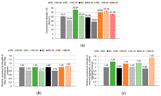 The results of the compressive strength (CS) testing of mortar specimens are shown in Figure 9a as absolute values (mean CS of six specimens) and in Figure 9b,c as relative values with respect to fiber-free mortars (R0, RC, RA, and RB) and natural aggregate mortars (R0 and R0-W). Figure 9a also presents the standard deviation of the measurements. ANOVA confirmed statistically significant differences between mortars (F = 36.0, p < 0.001), with mortar composition accounting for most of the observed variance (η2 ≈ 0.87).