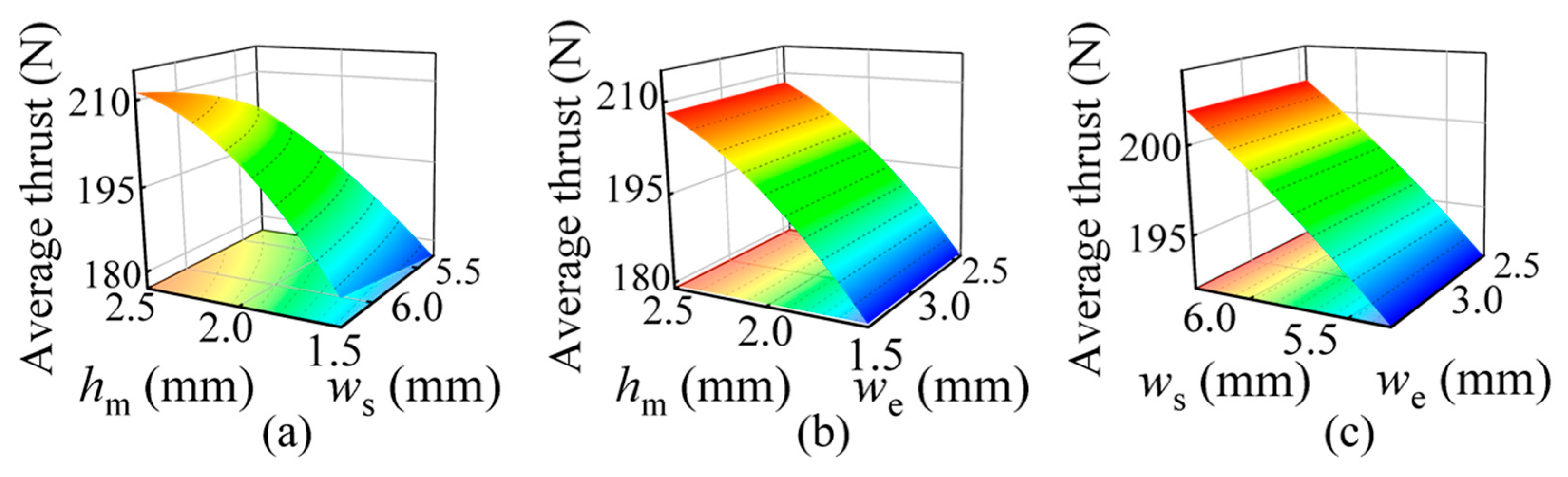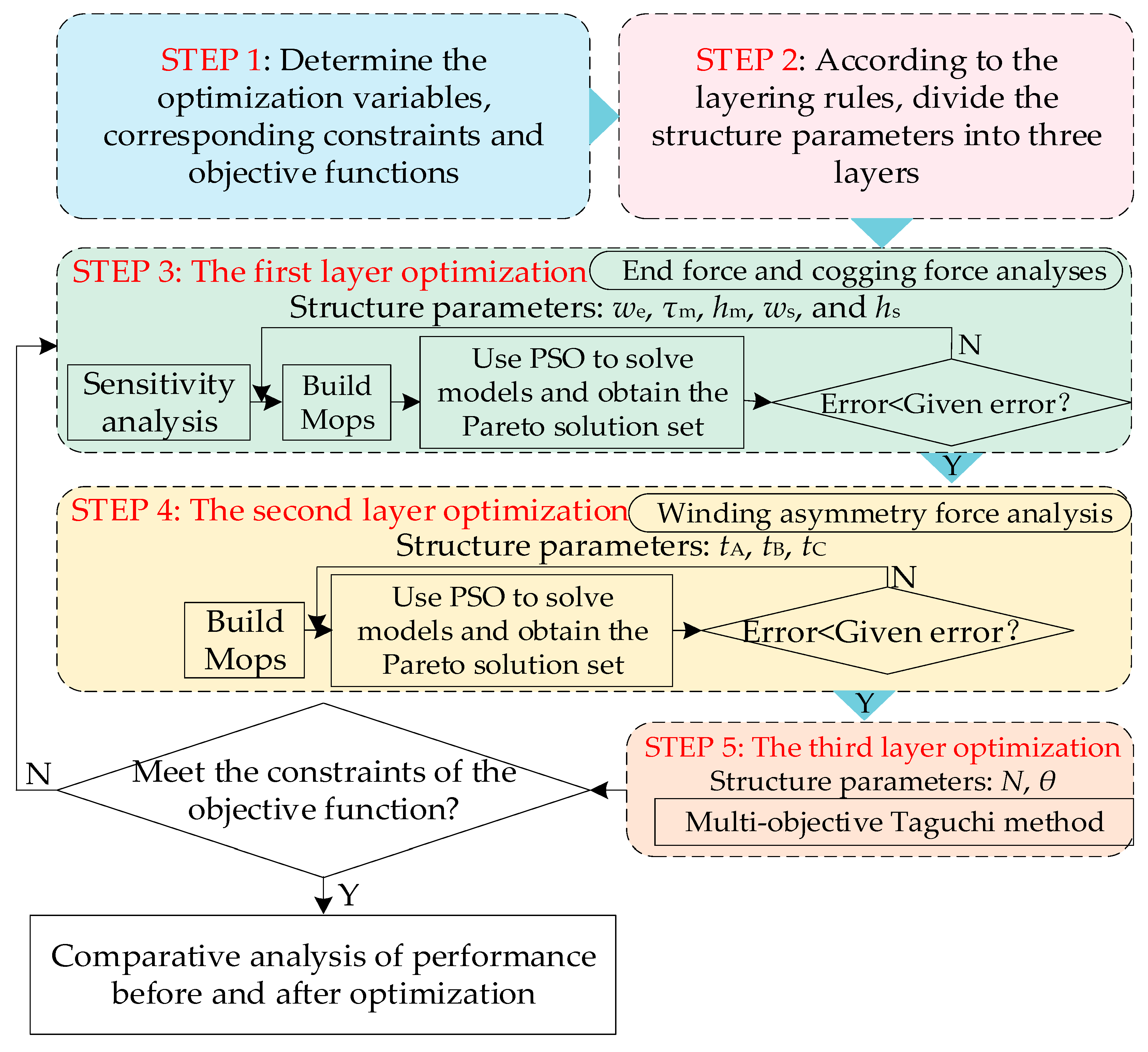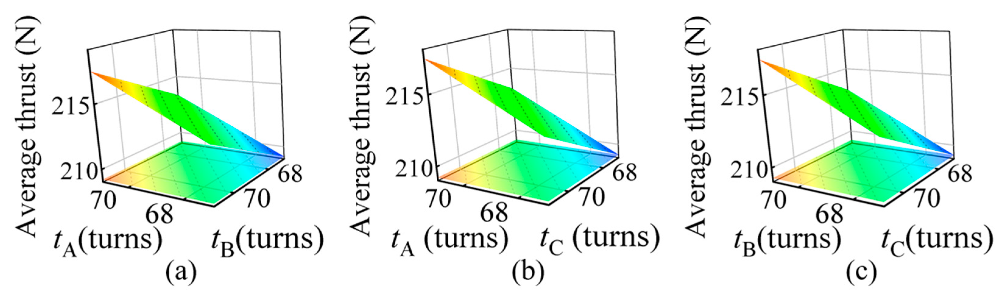 - Zhang, J.; Yan, J.; Chi, S.; Zhou, Y.; Ying, Z. Multi-objective optimization design of single side flat tooth unequal width permanent magnet synchronous linear motor based on layered strategy. J. Nanjing Univ. Sci. Technol. 2023, 47, 571–578. [Google Scholar]