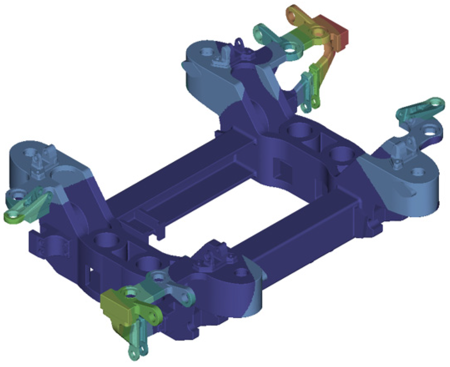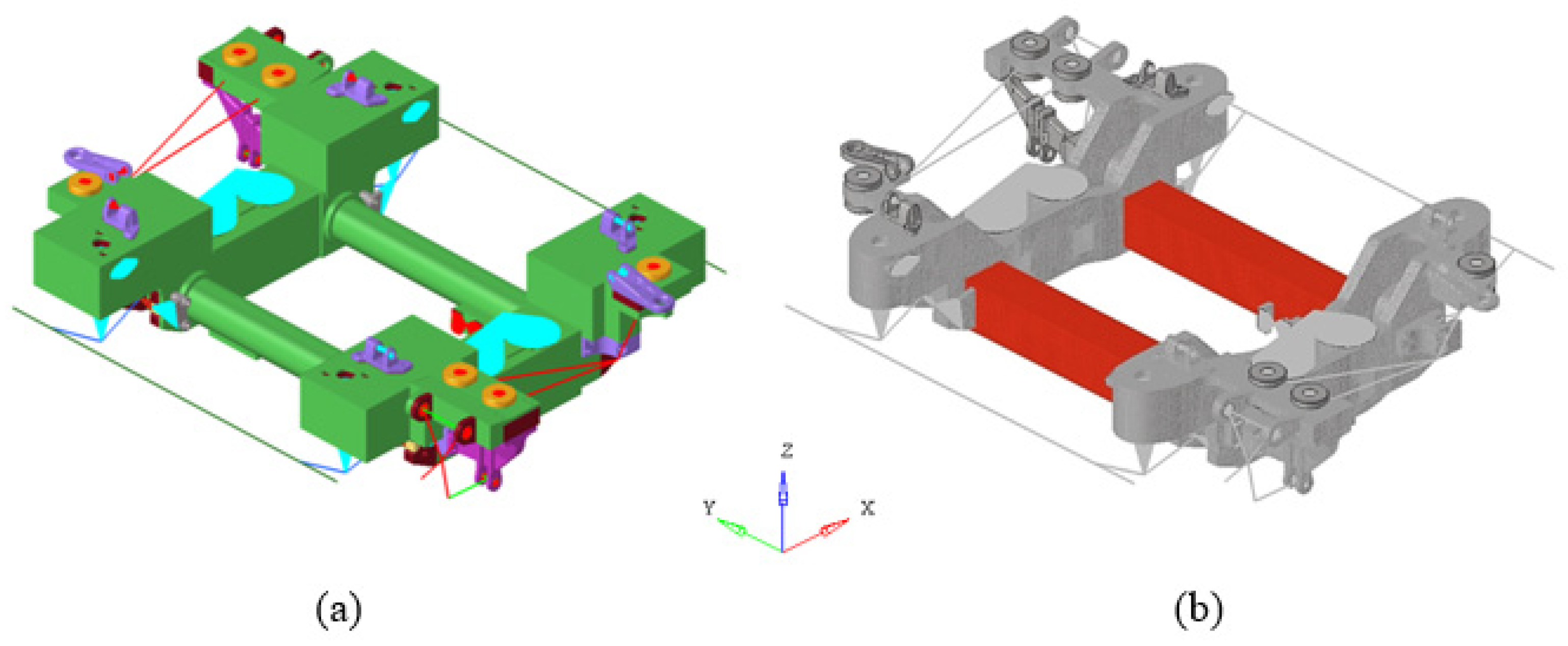 - A high-fidelity finite element (FE) model of the bogie frame was developed, including all equipment supports and the fundamental load interfaces required to properly reproduce the interactions with adjacent and interconnected subsystems;