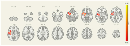 For the insula seed, pre-intervention connectivity was significantly greater than post-intervention in multiple regions (Table 5): the left inferior frontal gyrus (MNI: −48, +12, −02; cluster size = 266 voxels; p-FDR < 0.001), the right inferior frontal gyrus (+48, +10, +00; 256 voxels; p-FDR < 0.001), and the left ventral striatum/putamen (−28, +02, +08; 65 voxels; p-FDR < 0.001). These regions are commonly involved in emotional processing, interoceptive integration, and motor preparation, and the observed reductions in connectivity suggest decreased insula-driven engagement of salience and affective-motor circuits following the intervention.