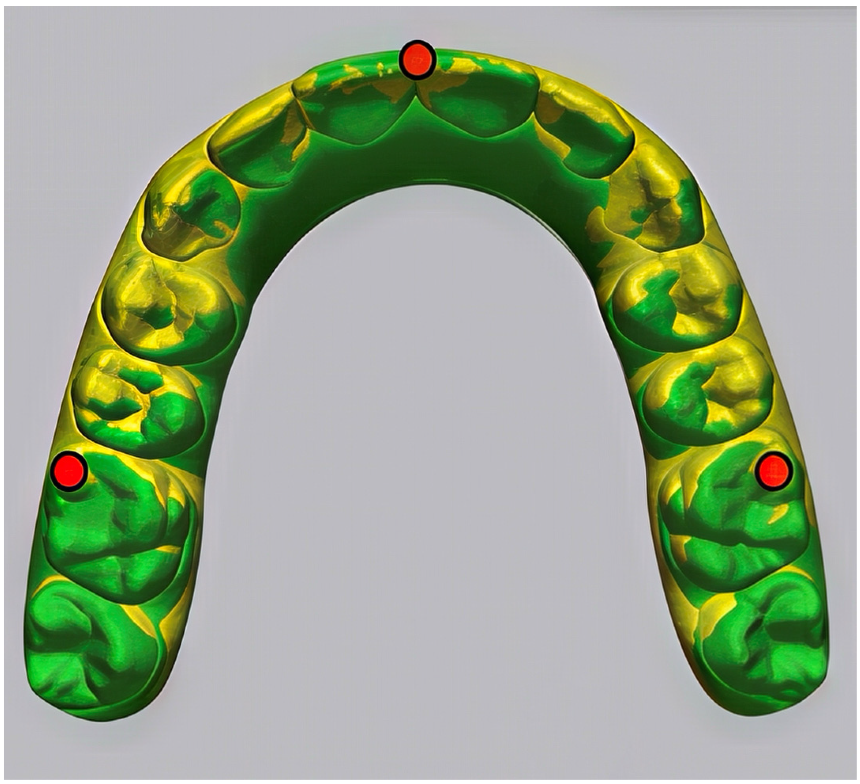 26], a marginal ridge discrepancy of 0.5 mm corresponds to a crown-tip deviation of 2° for an average-sized molar. Therefore, discrepancies ≥0.5 mm or more in mesiodistal, buccolingual/palatal, and occlusal-gingival directions, as well as angular discrepancies ≥2° or more in angulation, inclination, and rotation, were considered clinically relevant.