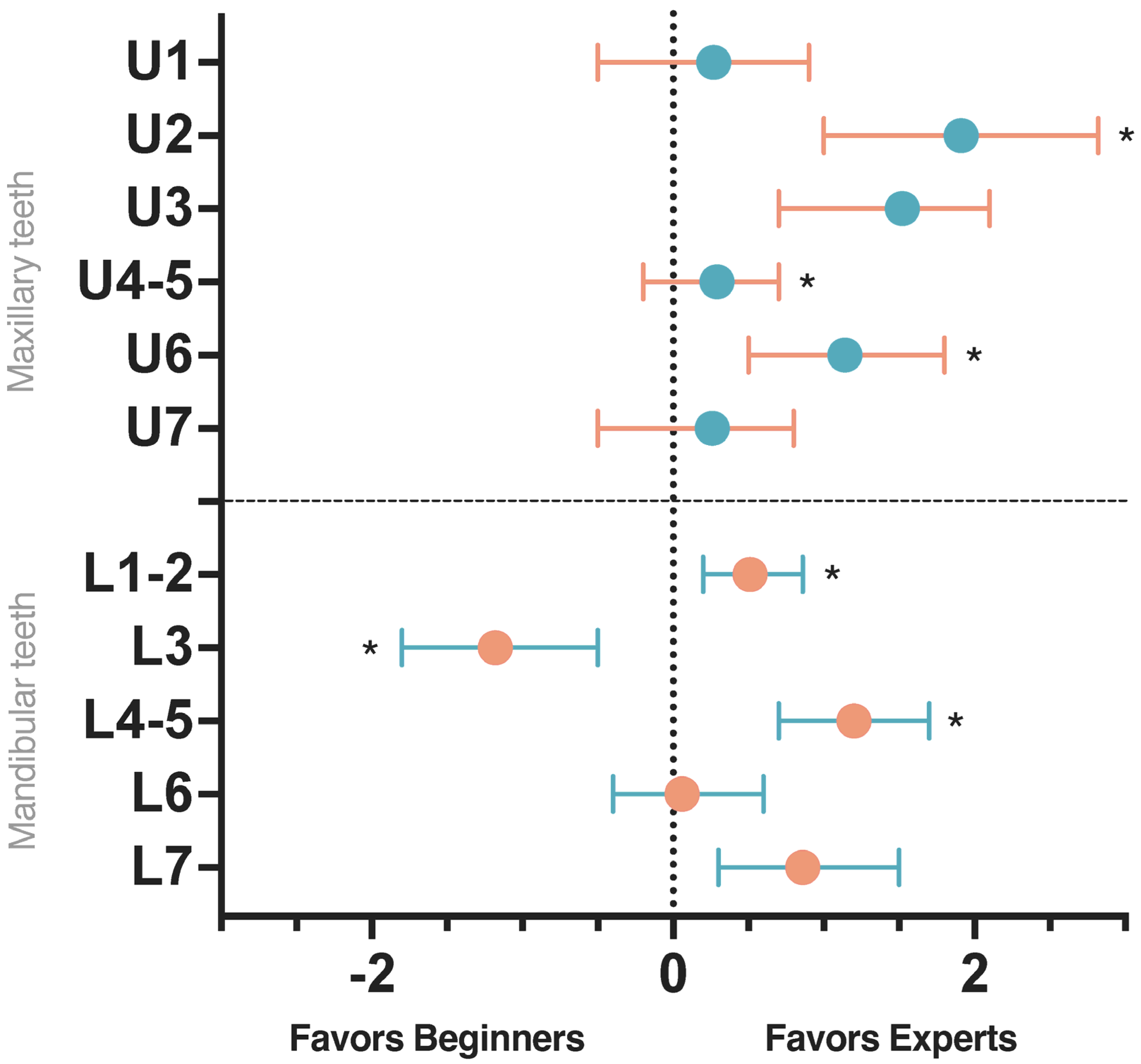 Figure 3). Experts demonstrated less lack of correction on maxillary first molars (median = 1.06°; IQR = 1.44) compared to beginners (median = 2.20°; IQR = 2.11; Δ = 1.14°; 95% CI [0.02, 2.26];