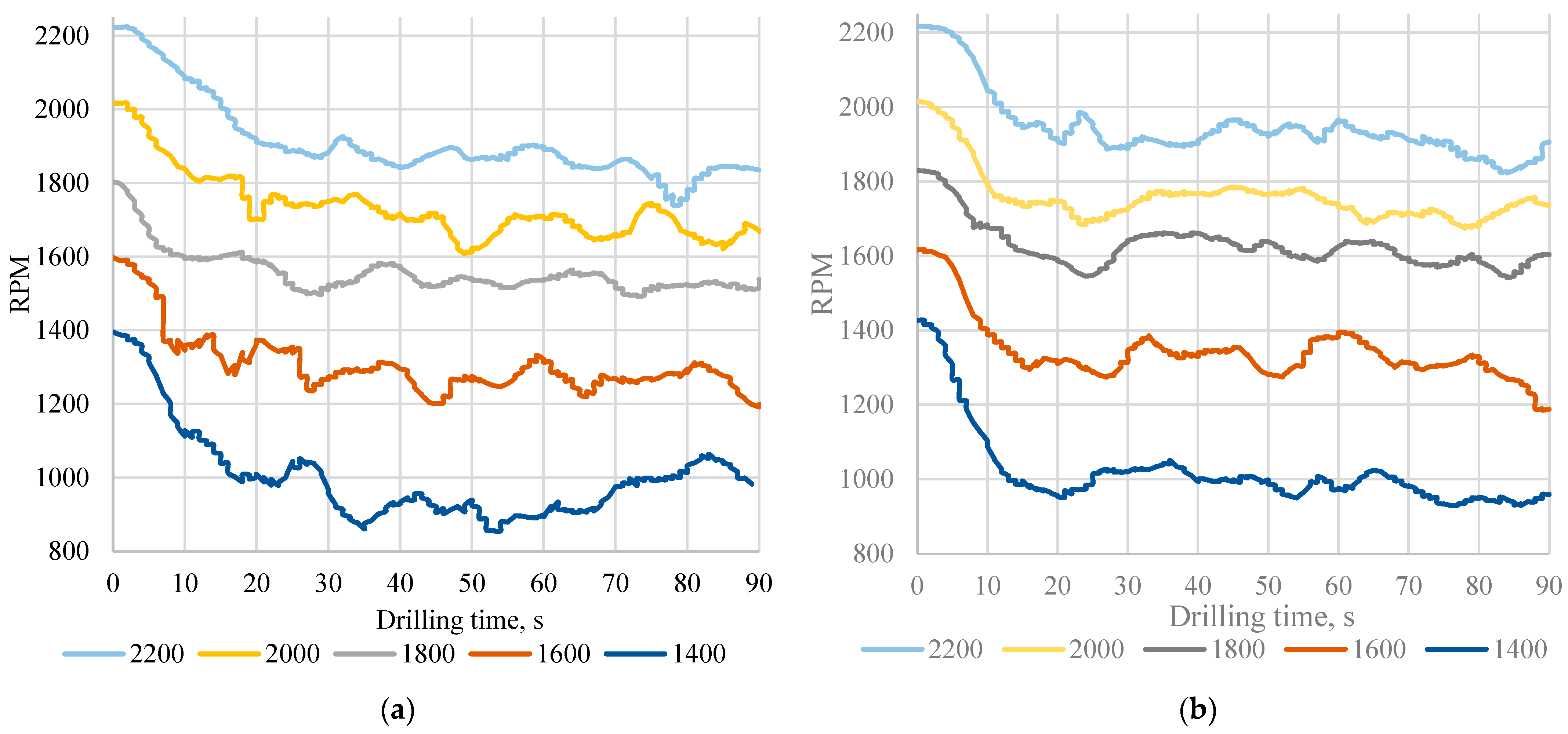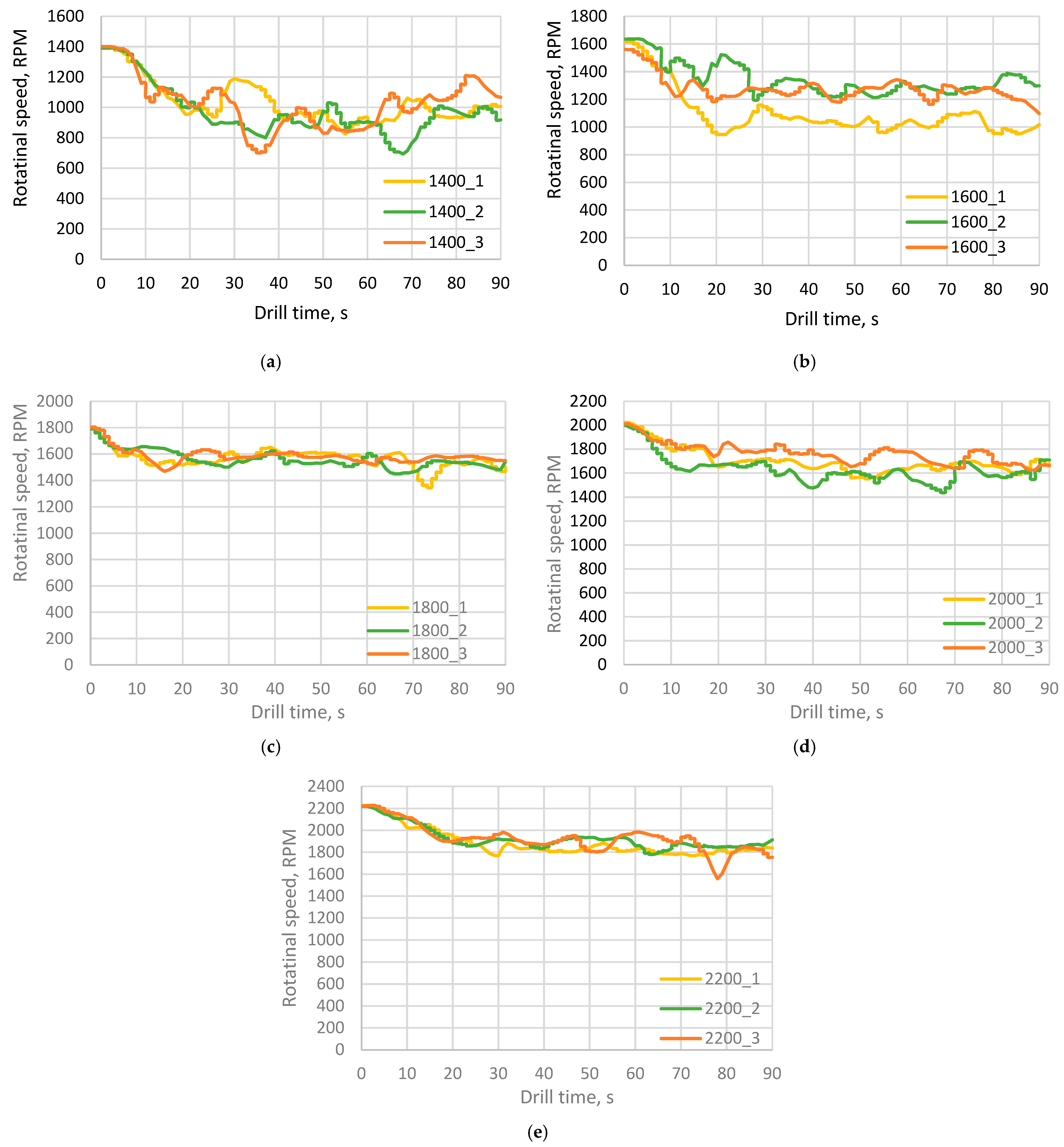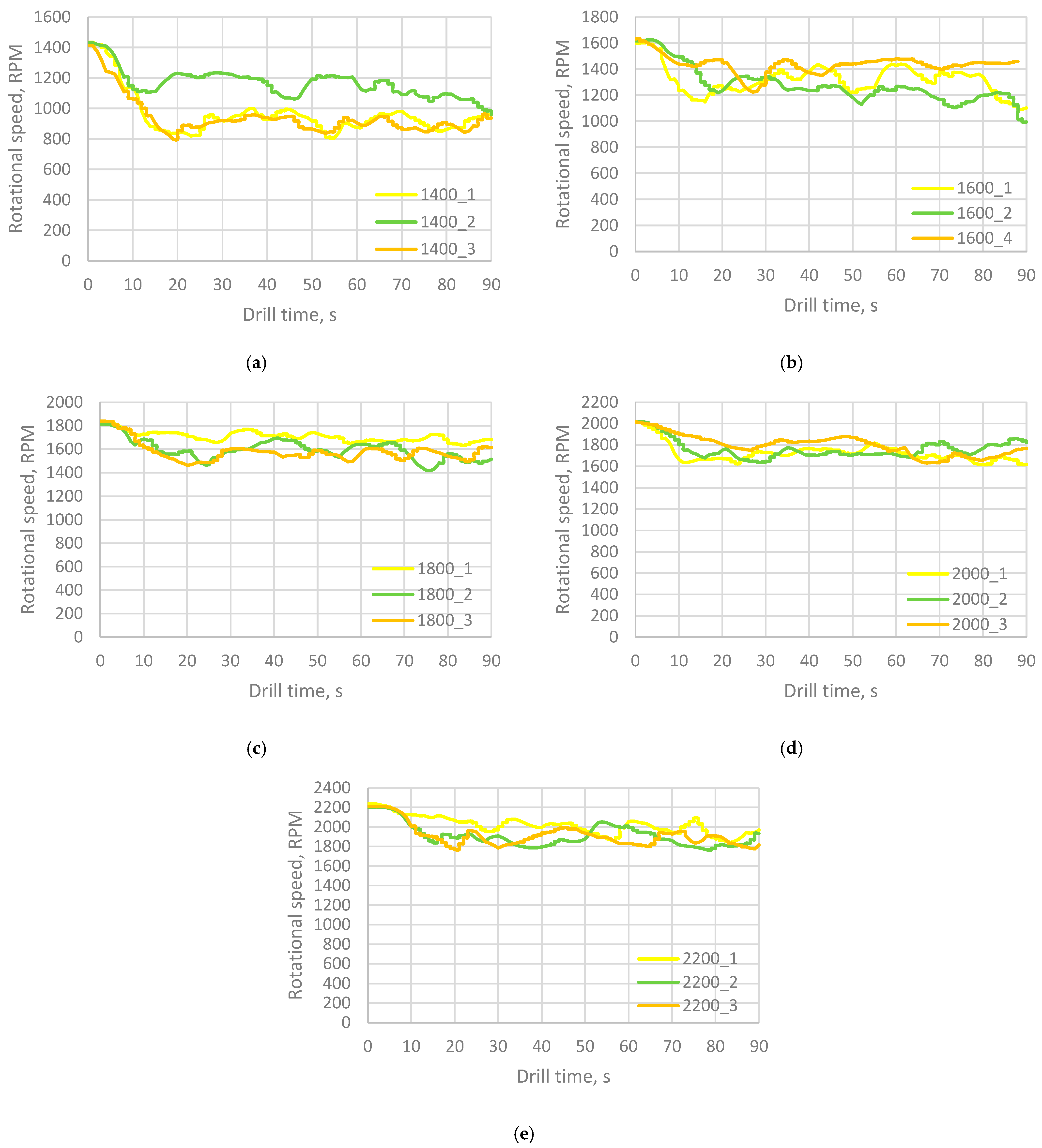 - The rotational speed response was found to be strongly influenced by the nominal drilling speed and material characteristics. All tests exhibited an initial RPM reduction upon engagement with the concrete surface, followed by a stabilized drilling regime. Across all nominal speeds, C50 concrete maintained consistently higher in-depth rotational speeds than C30, indicating more stable torque transfer and more efficient material removal in the stronger, denser material. Conversely, C30 exhibited greater RPM reduction, reflecting the increased frictional losses, vibration, and energy dissipation associated with micro-crushing and material heterogeneity.