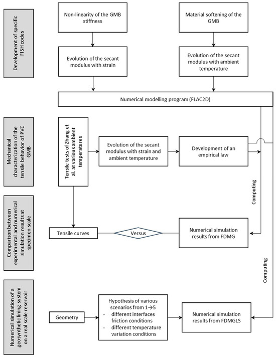 This study developed a non-linear, temperature-dependent constitutive law for PVC geomembranes in uniaxial traction, and demonstrated its relevance for assessing the stability of geomembrane-lined reservoir slopes subjected to elevated temperatures and thermal cycles. Calibration against experimental tensile data from 10 °C to 60 °C enabled the formulation of an empirical relationship to define the PVC mechanical behavior, capturing the marked reduction in stiffness and strength with increasing temperature. The incorporation of a thermal dilation response using a linear expansion law provided a realistic representation of thermally induced strain accumulation under thermal cycles.