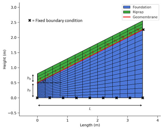 Concerning the boundary conditions, the geomembrane was fixed at the top end (crest), and the foundation was fixed at the bottom end, while the riprap was not restrained and hence free to deform under loading (see Figure 2). Gravitational loading was applied progressively to reach equilibrium.