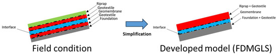 For simplicity, the geotextile on both sides of the geomembrane has been modeled as an interface element. Hence, the geomembrane has an upper and lower interface that replicates its interaction with a geotextile by considering the interface friction angle between the two elements as a behavior-defining property. Implicitly representing the geotextile layers as interface elements, with a defined frictional behavior, provides an efficient means to capture the principal tensile interactions without over-specifying the material properties of the geotextiles, aligning with the objective of predicting tensile forces in the geomembrane while retaining computational efficiency and robustness in the presence of interface slip or micro-slippage between the geomembrane (GMB) and geotextiles (GTX). Figure 3 shows the relevant simplifications made in our FDMGLS compared to the actual field condition.