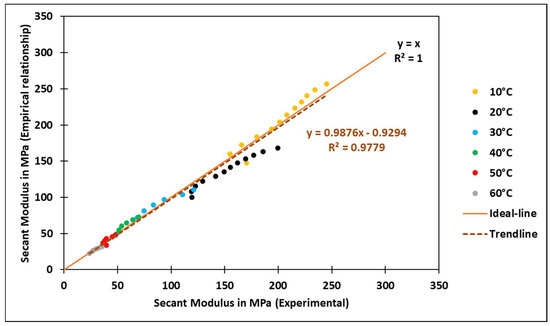 Linear fittings were made to the datasets to obtain the variation in secant modulus at each individual tested temperature, as can be seen from Figure 4. The variation in the secant modulus (Es) with strain, at a unique temperature, can be expressed as: