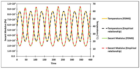 Currently, the FDMGLS model only focuses on the mechanical efforts developed in the GMB due to the variation in ambient temperature or interface friction angles. It is mentioned in detail in Section 3.2.4 that the addition of viscous efforts in the model (in the empirical relationship) and temperature-dependent interface friction angles will improve the overall accuracy of the model (realistic behavior). This will also help to extend the model’s ability to study the overall stability of the structure (GMB and riprap) due to the variation in ambient temperature, which will vary both the tensile resistance of the GMB and interface friction angles. Furthermore, the empirical relationship (secant modulus) can be modified so that it varies with the aging of the GMB, and hence the model can consider the degradation of the GMB due to aging in the study of the overall stability of the system.