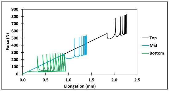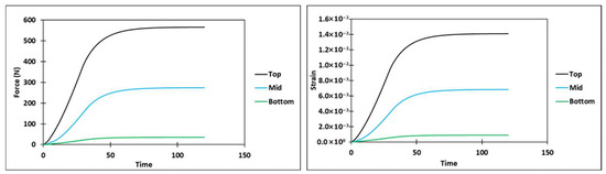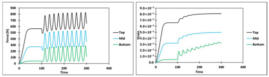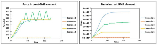 It can be observed from Figure 14 that the force and strain in the GMB elements increase as we move from the toe to the crest of the slope. It is the correct behavior, since the load on the upper elements is more due to the accumulation of self-weight of the structure, resulting from the increasing number of lower elements. For example, for the fifth cycle of temperature (roughly at time = 187), the difference in tensile force for the peak between the top and mid GMB element is 56%, 90% between the mid and bottom element, and 197% between the top and bottom element. As far as why the force variation looks similar in all the elements, it can be attributed to the fact that the geometry and material properties in the FDMGLS are homogenous (no local asperities or variation in friction angle). Furthermore, it can be clearly observed that the force varies significantly with the thermal cycles; for example, the variation in the force at the fifth thermal cycle is 42%, 85%, and 438% for the top, mid, and bottom GMB elements, respectively, as we move from 60 °C to 20 °C. The force decreases as the temperature increases due to the material softening. Another observation that can be made is that there is a sharp increase in the strain as soon as the first thermal cycle is applied, and then this variation decreases as the number of thermal cycles increases.