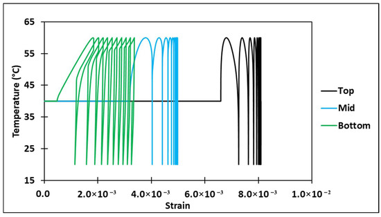 It can be observed from Figure 16 that the strain in the bottom GMB element reduces with the decrease in temperature, and vice versa. When the temperature starts to reduce from the peak, the elongation continues to increase for a few degrees Celsius, and then the GMB element starts to contract and the strain reduces. After reaching a certain temperature (roughly below 37 °C) for the bottom GMB element, this variation in strain becomes almost negligible. However, it is important to note that when the temperature increase restarts, the variation in strain follows a different path than the one followed while the temperature was decreasing. Also, the threshold temperature for the increase in strain (elongation) with the rise in temperature increases with the greater number of thermal cycles applied. For the mid and top GMB element, no contraction of the GMB is observed, even though the temperature is decreasing. This can result due to the greater load needed to be supported by these elements, and hence the contraction thermal force is not enough to cause a contraction (upward movement along the slope) of the GMB. Furthermore, for all the GMB elements, the amplitude of variation in strain resulting from the variation in temperature reduces with the increasing number of thermal cycles.