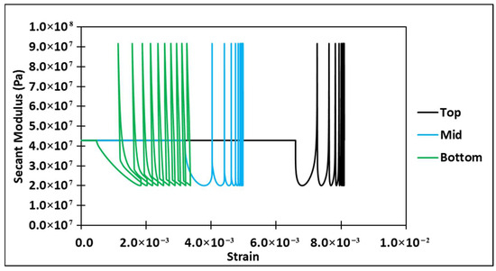 Secant modulus as a function of strain in different GMB elements for Scenario 5 (2).