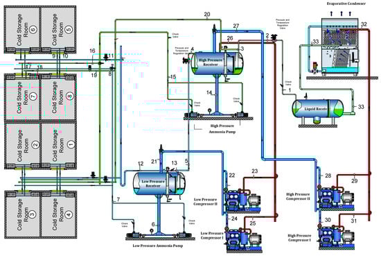 In the integrated cold storage facility investigated in this study, a two-stage vapor compression refrigeration cycle was implemented to supply cold rooms operating at different temperature levels from a single centralized system. While single-stage refrigeration cycles can adequately serve cold rooms operating at relatively higher temperatures, a staged compression configuration is required for frozen storage rooms operated at −18 °C. The use of a two-stage cycle allows low-temperature requirements to be met while maintaining compressors within more favorable operating ranges.