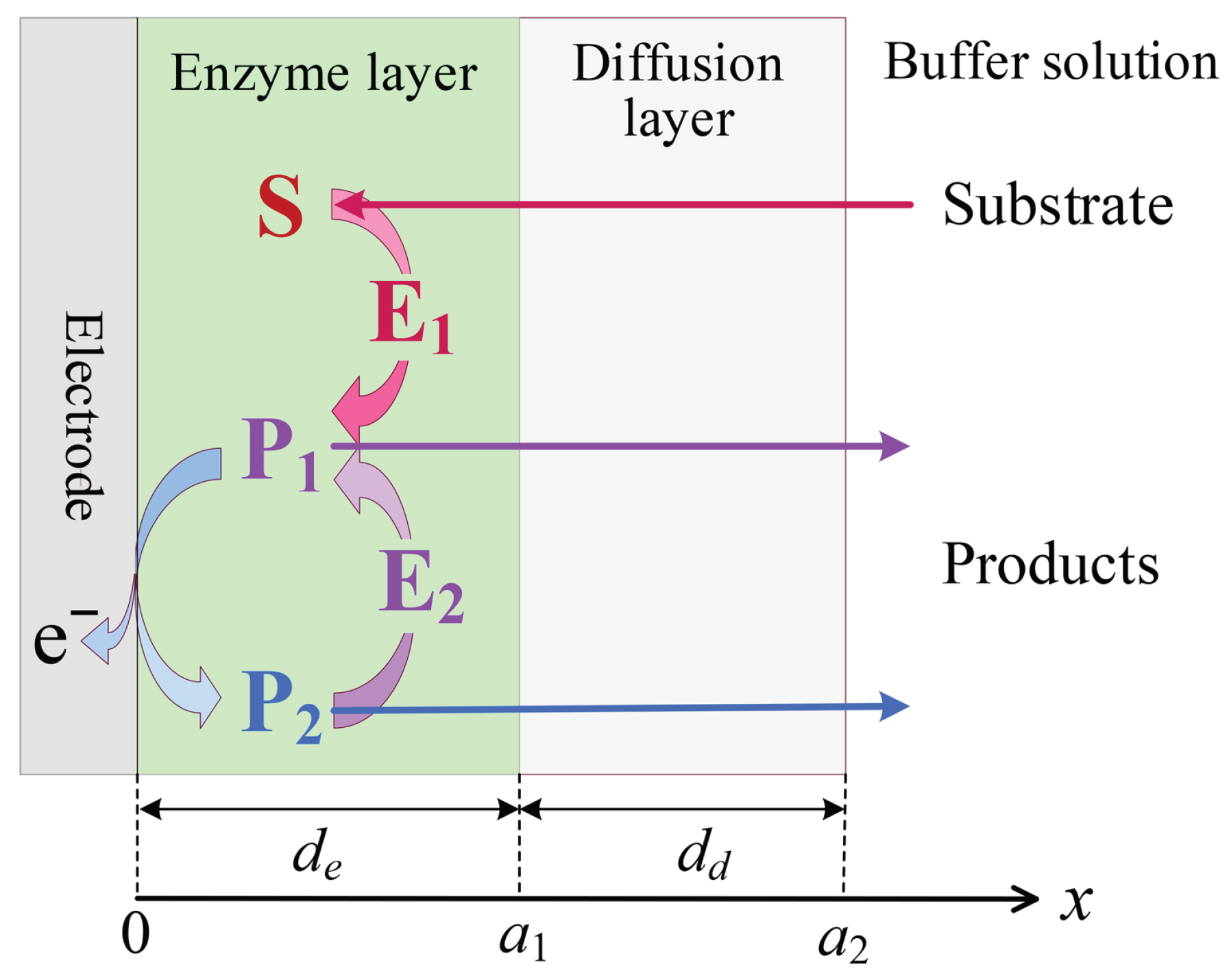 - Suganya, S.T.; Rajendran, L.; Lyons, M. Analytical expression of concentrations and current in enzyme-based two-compartment model of amperometric biosensors for steady-state condition. Int. J. Electrochem. Sci. 2022, 17, 220238. [Google Scholar] [CrossRef]