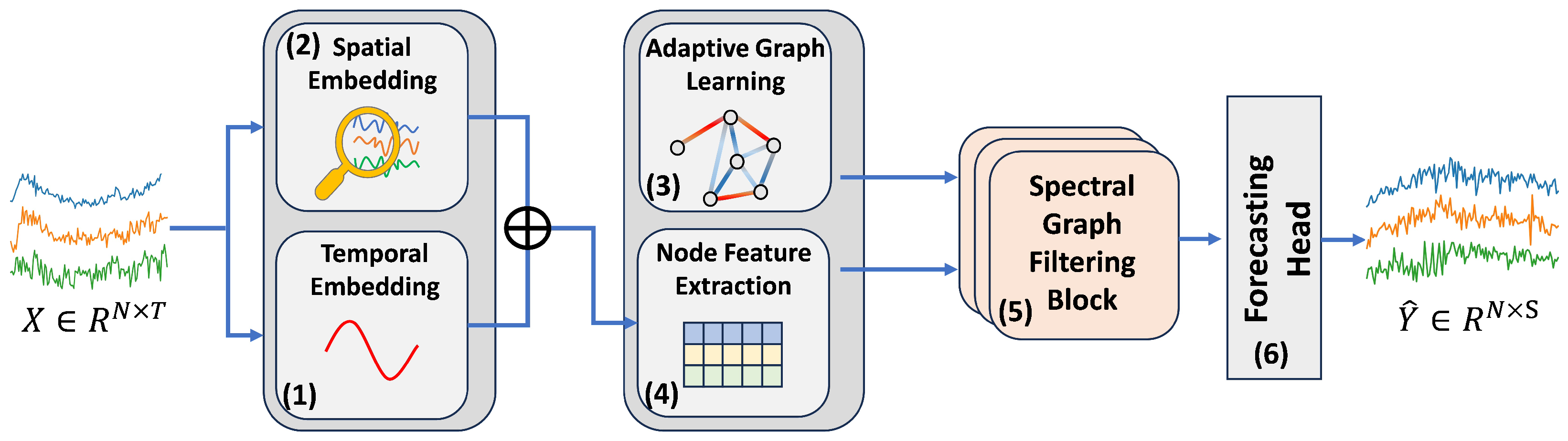 - Frequency-aware spatial modeling—We design an enhanced ChebNetII-based spectral graph filtering block that captures both global and local spatial dependencies, boosting forecasting accuracy.