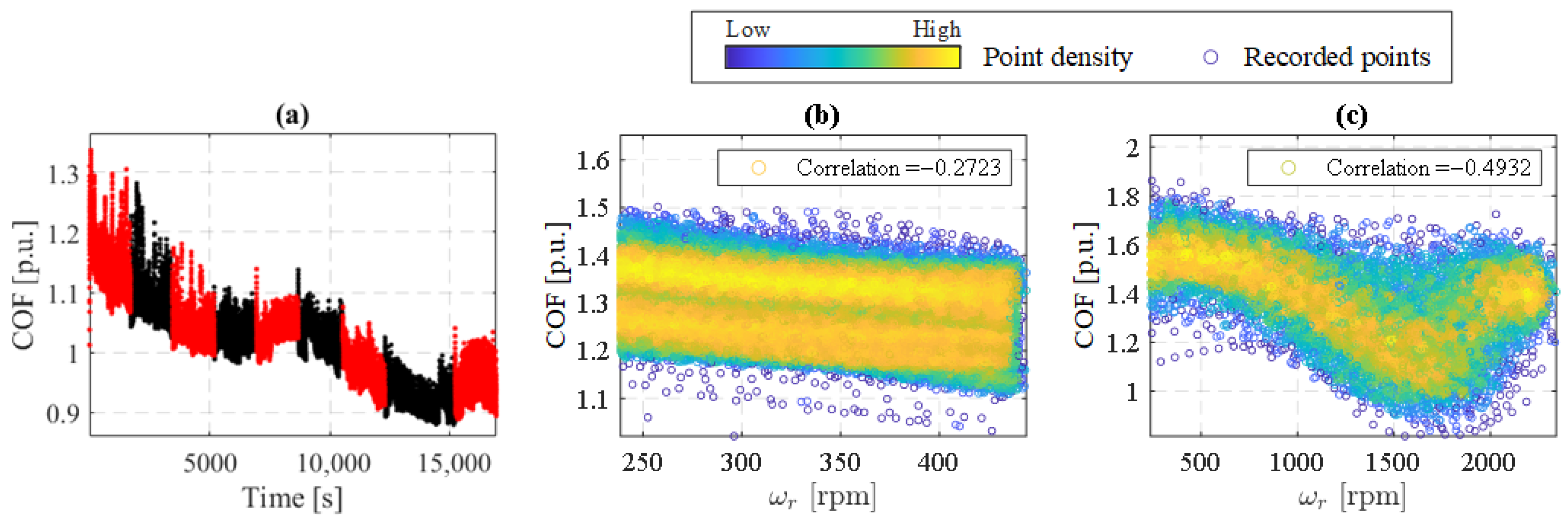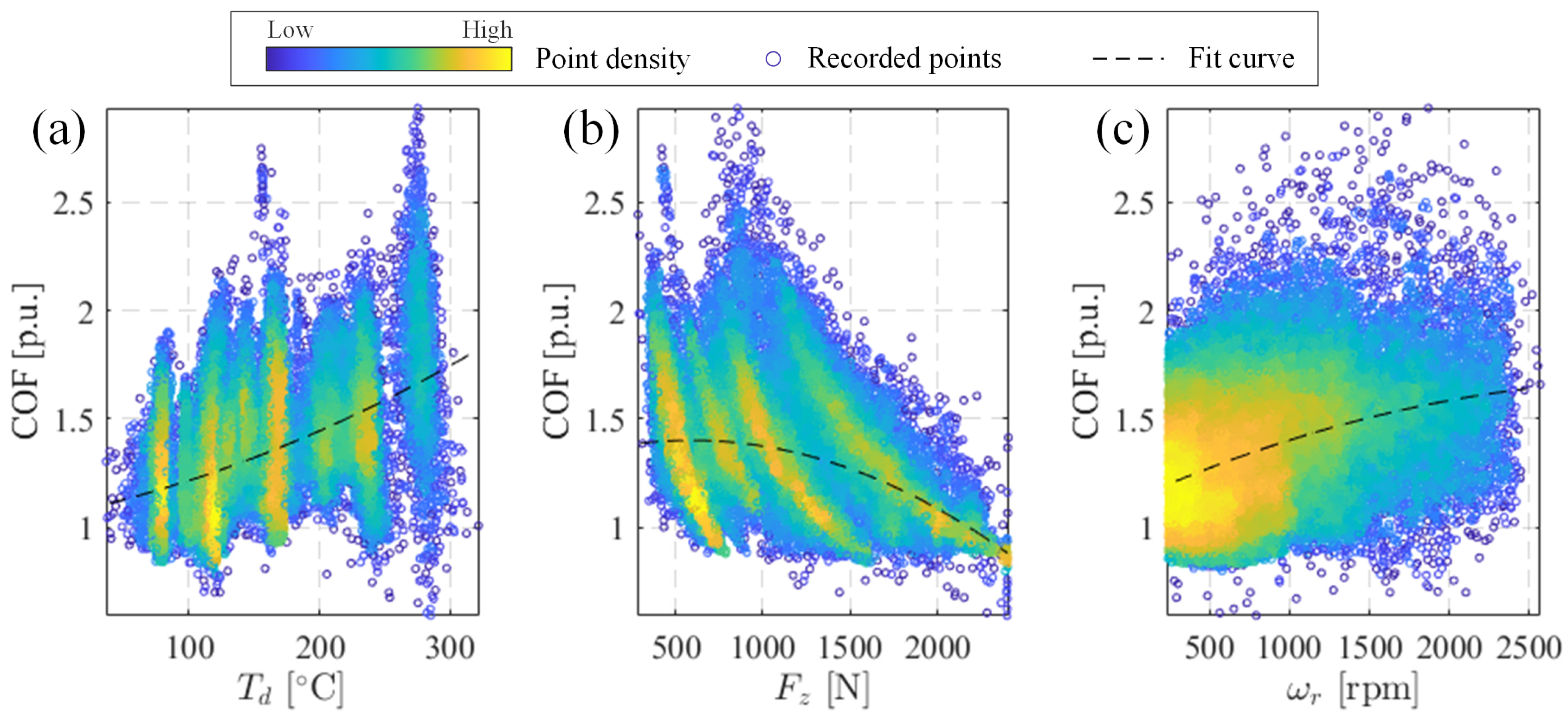 | Negative COF vs. slip speed correlation | 17 (14%) correlation < −0.2: 6 (5%) | 34 (28%) correlation < −0.2: 14 (11%) | 27 (22%) correlation < −0.2: 8 (7%) |