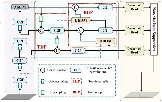 The overall architecture of the proposed DFED-Net is illustrated in Figure 2. The network is built upon the YOLOv8 framework, comprising three core components: the AMFM replaces the original Spatial Pyramid Pooling—Fast (SPPF) module in the backbone network; the DBDM is integrated into the feature pyramid network (FPN) path; the DySample modules replace the traditional upsampling operations in the neck. The interaction is sequential and complementary: AMFM provides high-quality, context-aware features; DBDM carefully downsamples these features while preserving detail; and DySample efficiently upsamples them to recover precise spatial localization for the detection heads. This co-design ensures that both semantic richness and spatial accuracy are maintained throughout the network, enabling precise and fast detection.
