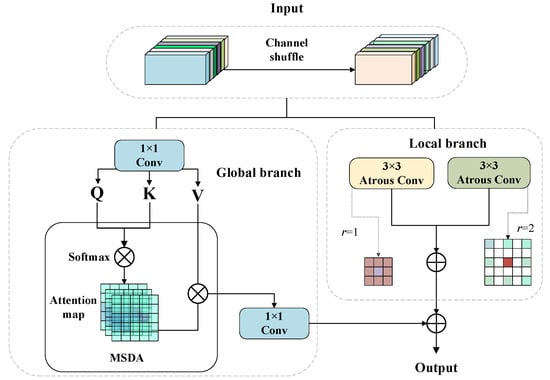 The input, illustrated in Figure 3, is first reshuffled via a channel shuffle operation to enhance cross-group channel interaction. The reorganized features are then processed in parallel by the local and global branches to promote multi-scale feature representation.