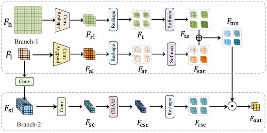 The second branch employs an improved convolutional downsampling method. First, the current-level feature map undergoes a stride of 1 convolution to preserve spatial information, producing . A subsequent stride of 2 convolution downsamples F_sl generating with rich spatial details. The convolutional block attention module (CBAM) [28] is then applied to F_sc, yielding the enhanced feature map . Finally, a reshape operation restores the original spatial structure, producing the output , an enriched lower-level feature representation with preserved spatial information.