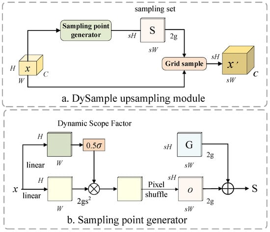 In steel defect detection, the upsampling module is critical for recovering boundary details and object shapes from low-resolution features. Conventional methods such as nearest-neighbor interpolation depend only on pixel coordinates and neglect semantic content, limiting detail reconstruction in complex scenes. While recent approaches improve feature modeling via dynamically generated kernels [29], these approaches incur high computational cost and parameter overhead because of dynamic convolutions and auxiliary subnetworks. To address these limitations, this study adopts DySample [30], a dynamic, point-based upsampling module, instead of conventional upsampling operations.