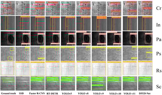 Additionally, a set of sample images exhibiting diverse defect types was randomly selected for comparative analysis, as shown in Figure 9. The visualization results demonstrate that DFED-Net achieves more accurate localization and identification of defects, with tighter bounding boxes and overall superior detection performance compared with other algorithms.