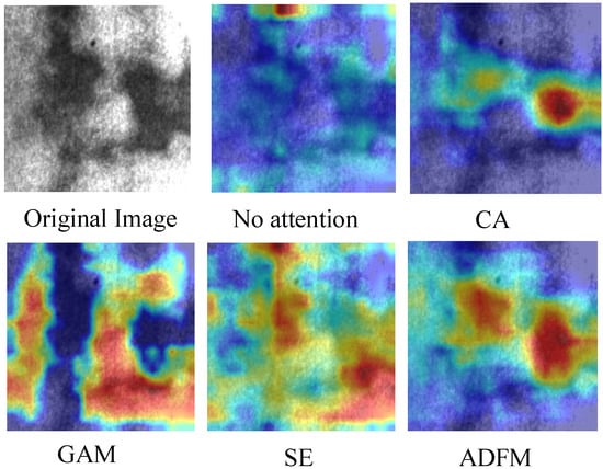 Figure 10 illustrates the feature activation maps under different modules. Diffuse responses occur in the absence of attention, primarily concentrated on image edges and background areas, with insufficient focus on defect regions. CA exhibits weak activation intensity and poor response to defect structures. SE and GAM are biased by bright textures, assigning high responses to non-defective regions. In contrast, AMFM achieves the strongest and most compact activation over defect regions, effectively suppressing background interference and yielding more discriminative feature representations. The enhanced focusing capability stems from the synergistic design of global feature fusion and key-region feature enhancement, enabling precise defect localization while reducing redundant computations. Compared to existing attention mechanisms, which are compromised by background distraction, scattered attention, or limited accuracy gain, AMFM demonstrates superior feature aggregation capability, confirming its effectiveness and suitability as the core module in DFED-Net.