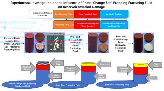 The experimental procedure involved: (1) Flow experiments using cores of different permeabilities, (2) damage experiments with guar gum, slickwater fracturing fluid, and phase-change self-propping fracturing fluid, and (3) sectioning of damaged cores to determine the invasion depth. This comprehensive approach was used to analyze the damage profile and, consequently, the damage performance of the self-propping fluid under simulated reservoir conditions.