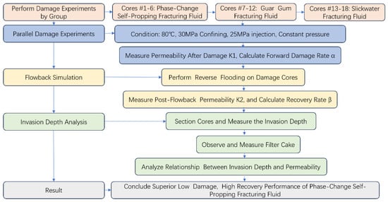 Flowchart of the parallel core damage experiments. The diagram illustrates the comparative experimental design for evaluating the damage and recovery performance of three fracturing fluids (phase-change self-propping, guar gum, and slickwater) on rock cores, including damage induction, flowback simulation, and invasion depth analysis.