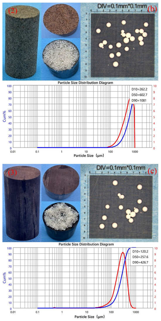 In the displacement experimental apparatus, the solid particles formed by the phase-change self-propping fracturing fluid were well-distributed and exhibited superior sphericity compared to conventional ceramic or quartz sand proppants. Figure 5, Figure 6, Figure 7, Figure 8 and Figure 9 present microscopic images and particle size distributions (The BT-9300S laser particle size analyzer is a new model developed by Bettersize Instruments Ltd., Dandong, China) of the solid particles formed inside the core holder across different core samples. The results indicate that these particles possess regular shapes, well-defined edges, and a concentrated size distribution, demonstrating favorable uniformity.