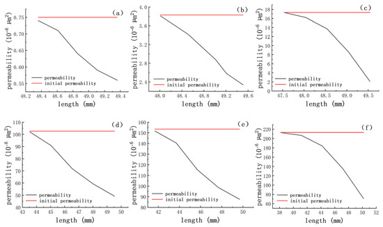Cores #7 to #12 are presented in figures (a–f), which illustrate the permeability damage inflicted on cores by the guar gum fracturing fluid and the subsequent recovery following flowback simulation.