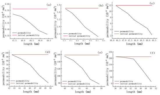 Cores #7 to #12 are presented in Figures (a–f), which show the invasion depth profile of the guar gum fracturing fluid into the core and the corresponding permeability restoration characteristics.
