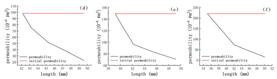 Cores #13 to #18 are presented in Figures (a–f), which show the invasion depth profile of the slickwater fracturing fluid into the core and the corresponding permeability restoration characteristics.