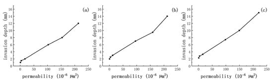 Relationship between fracturing fluid invasion depth and permeability ((a) shows the results using phase-change self-propping fracturing fluid, while (b) shows those using guar gum fracturing fluid, and (c) shows those using slickwater fracturing fluid).