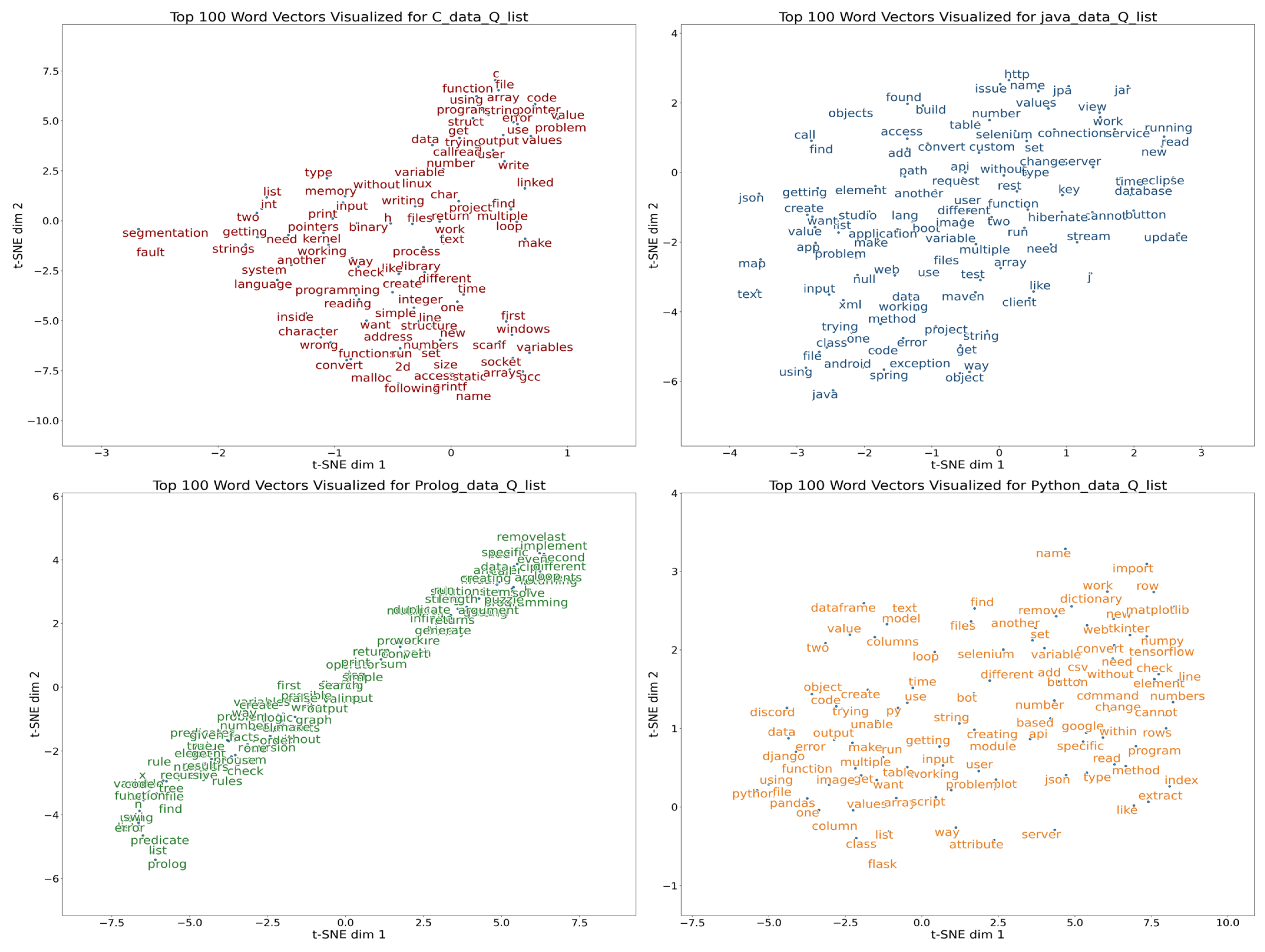 To address the brevity of Prolog Q&A texts, subword-level tokenization and lemmatization were applied prior to embedding training. Additionally, embeddings were trained separately for each programming language rather than using a shared corpus. As a result, embedding coordinates are not directly comparable across languages and are interpreted only within language-specific analytical contexts.