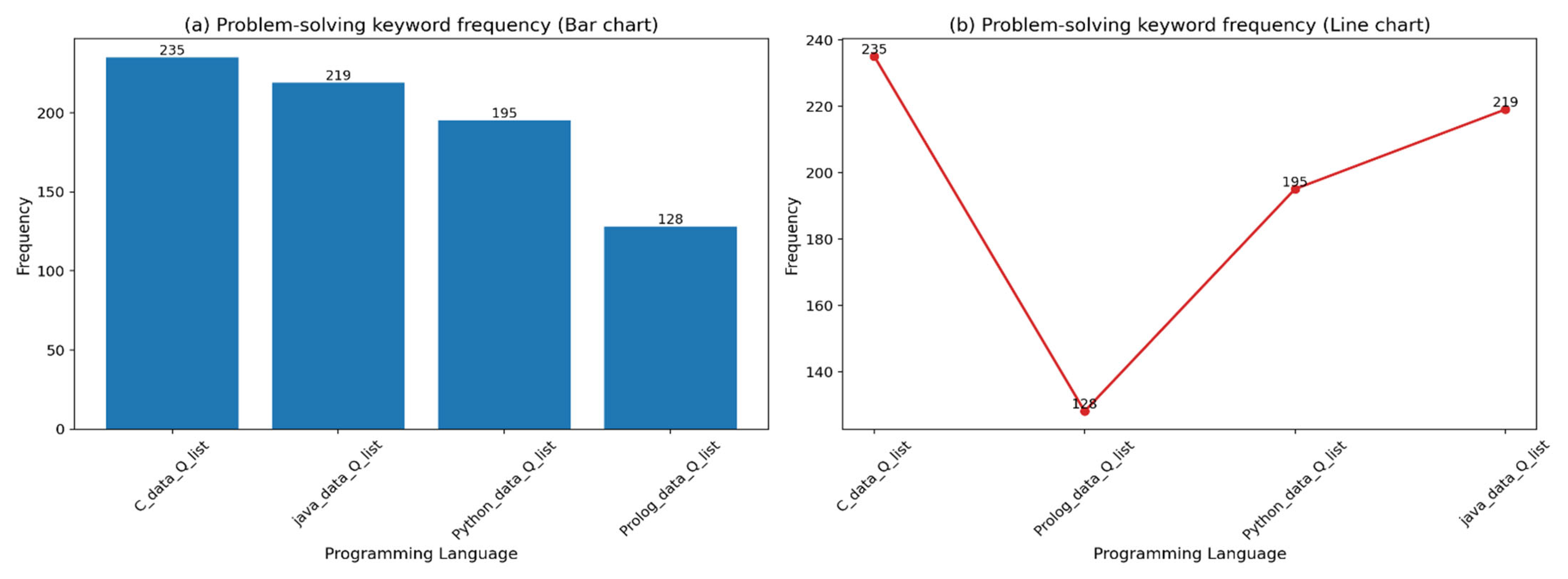 Figure 2 visualizes the distribution of problem-solving keywords across Python, C, Java, and Prolog, highlighting that C emphasizes debugging and error resolution, while Prolog places greater emphasis on logical inference tasks.