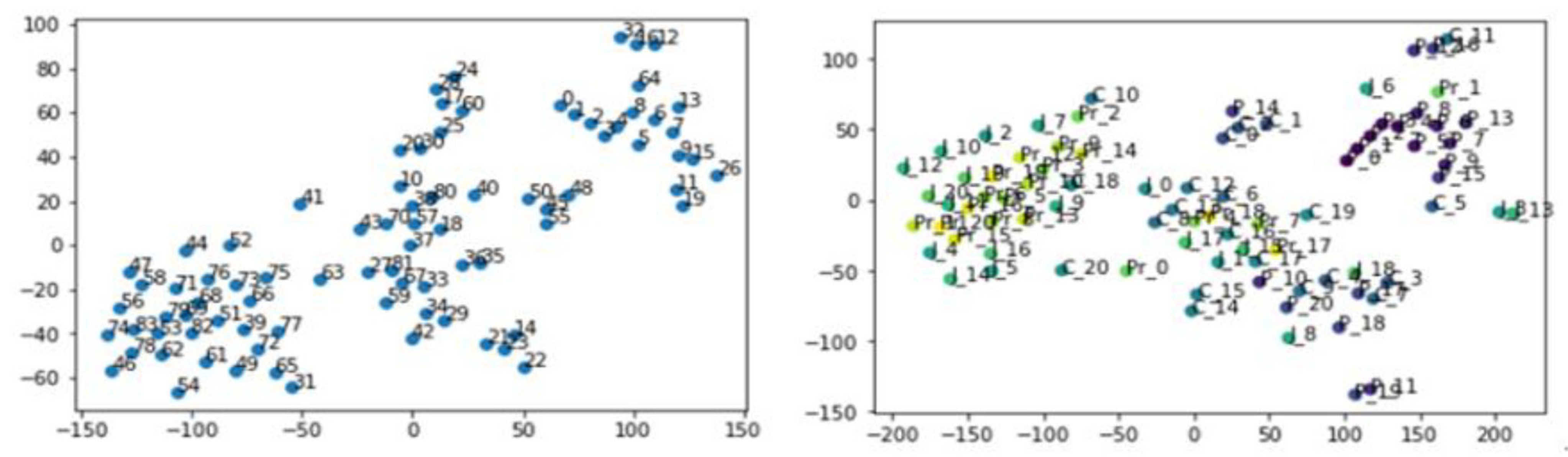 Table 7. Specifically, a total of 84 clusters extracted from the four languages were projected into a two-dimensional space, complementing the preceding clustering analysis.
