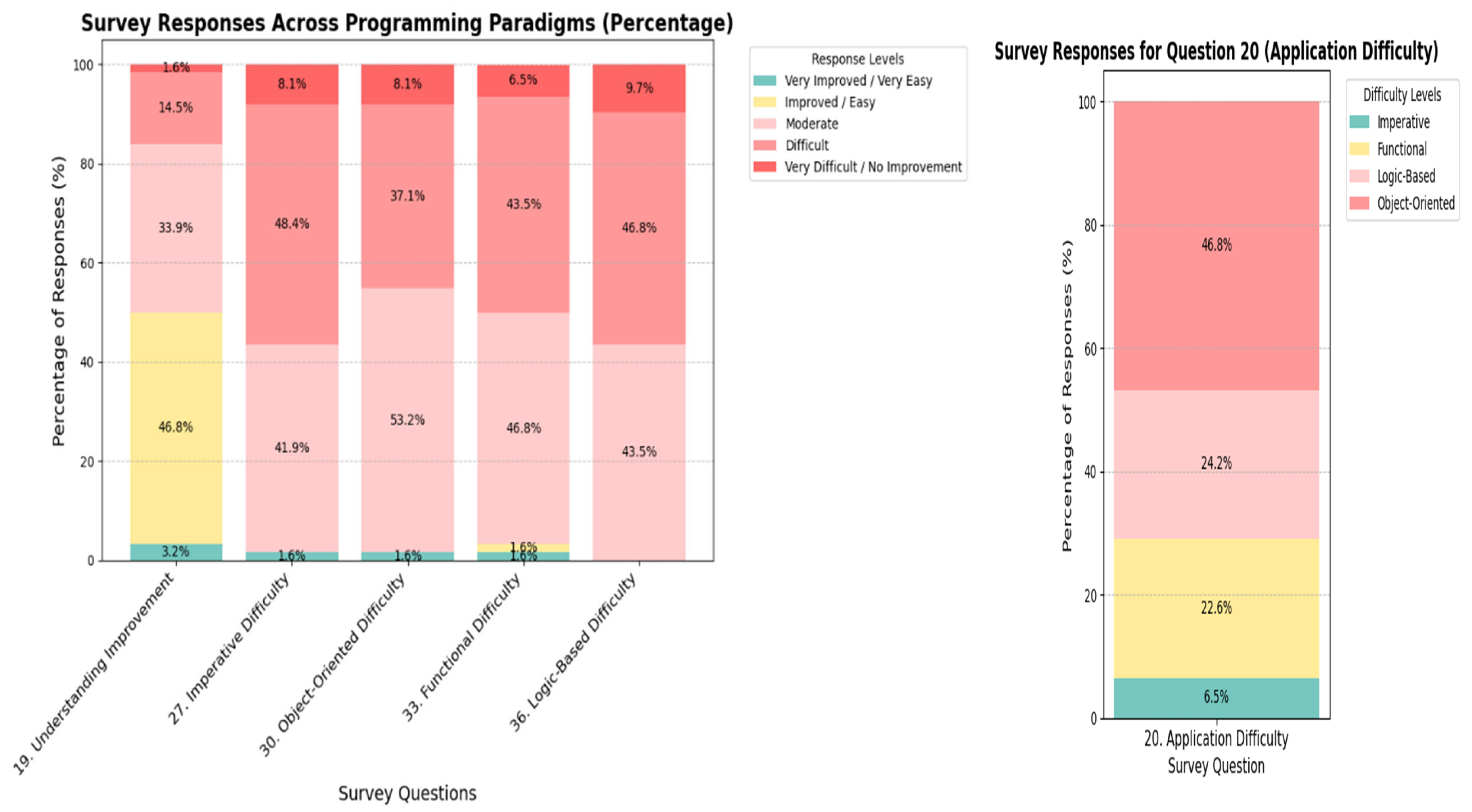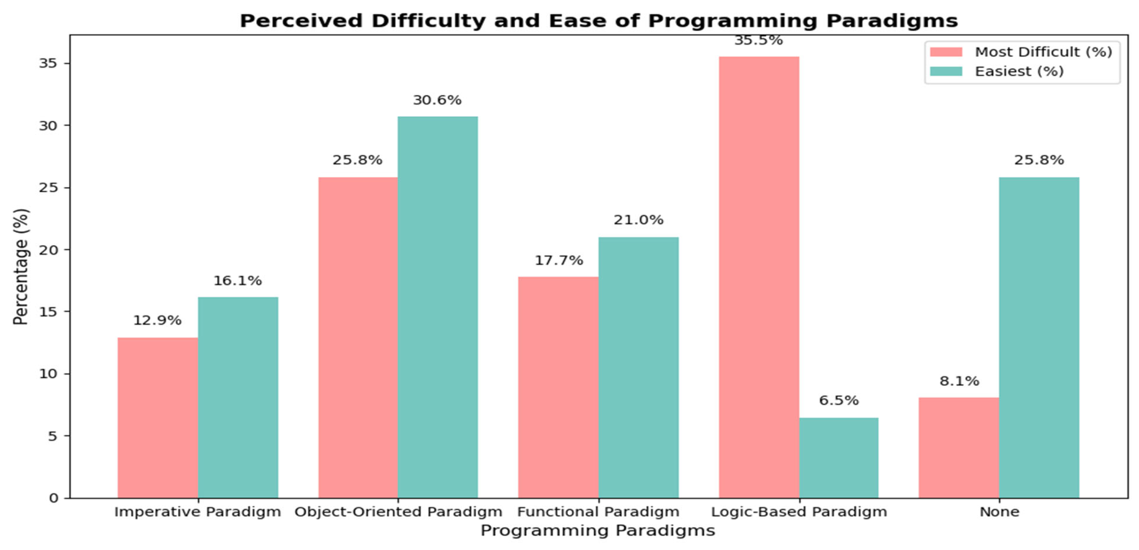Perceived application difficulty across paradigms (Q20): Object-oriented programming (OOP) was reported as the most difficult paradigm to apply in practice (46.8%), followed by logic-based (24.2%) and functional paradigms (22.6%). In contrast, the imperative paradigm was perceived as foundational, with the lowest reported application difficulty (6.5%).