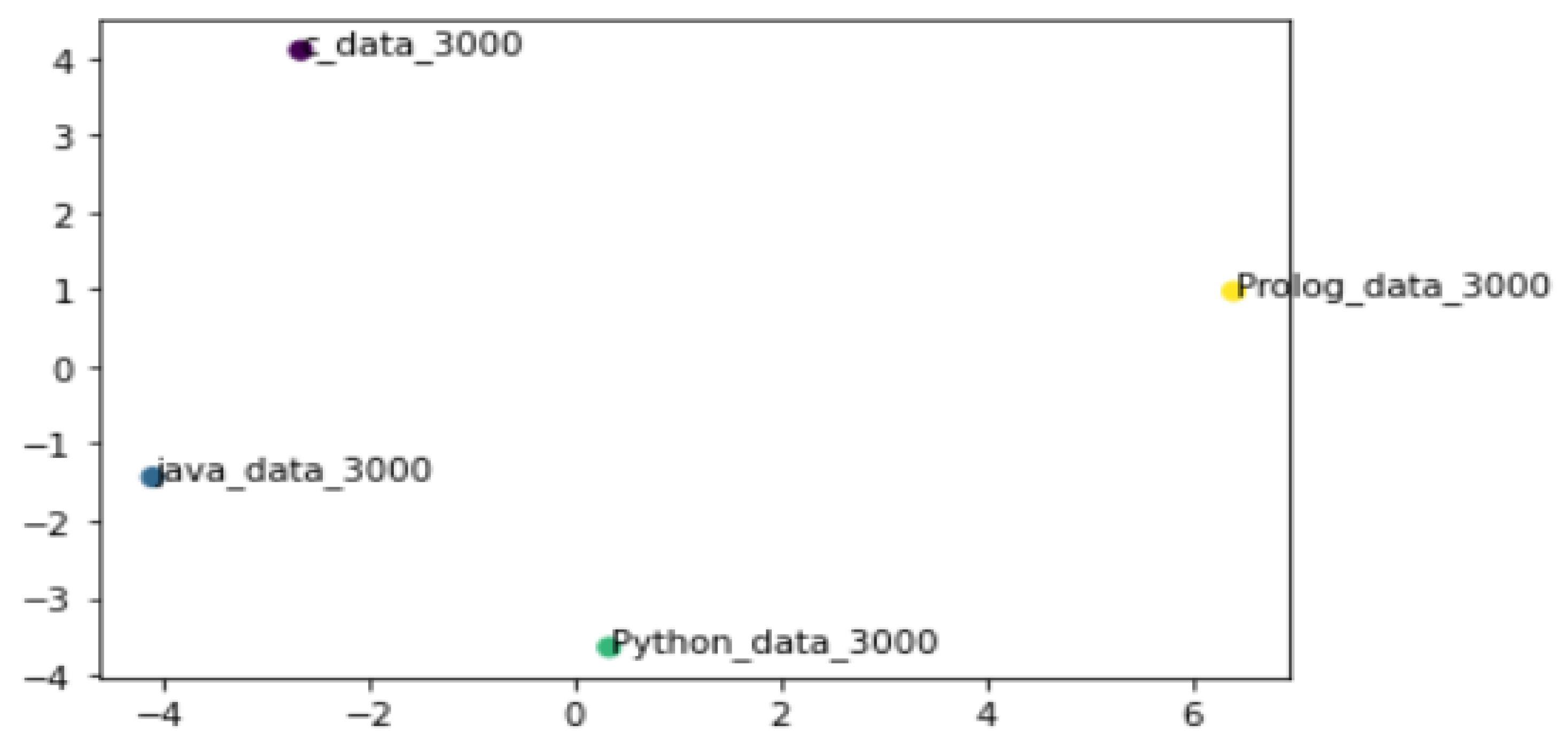 Figure 6 presents a two-dimensional projection of Doc2Vec embeddings derived from Stack Overflow question–answer texts, illustrating relative semantic positioning among programming languages as instantiated within the instructional and analytical context of this study. Doc2Vec models were trained separately for each language using identical hyperparameters, and the resulting document representations were summarized at the language level for visualization purposes. Accordingly, the figure should be interpreted as an illustrative representation of language-specific semantic tendencies rather than as evidence of absolute or directly comparable geometric distances across languages.
