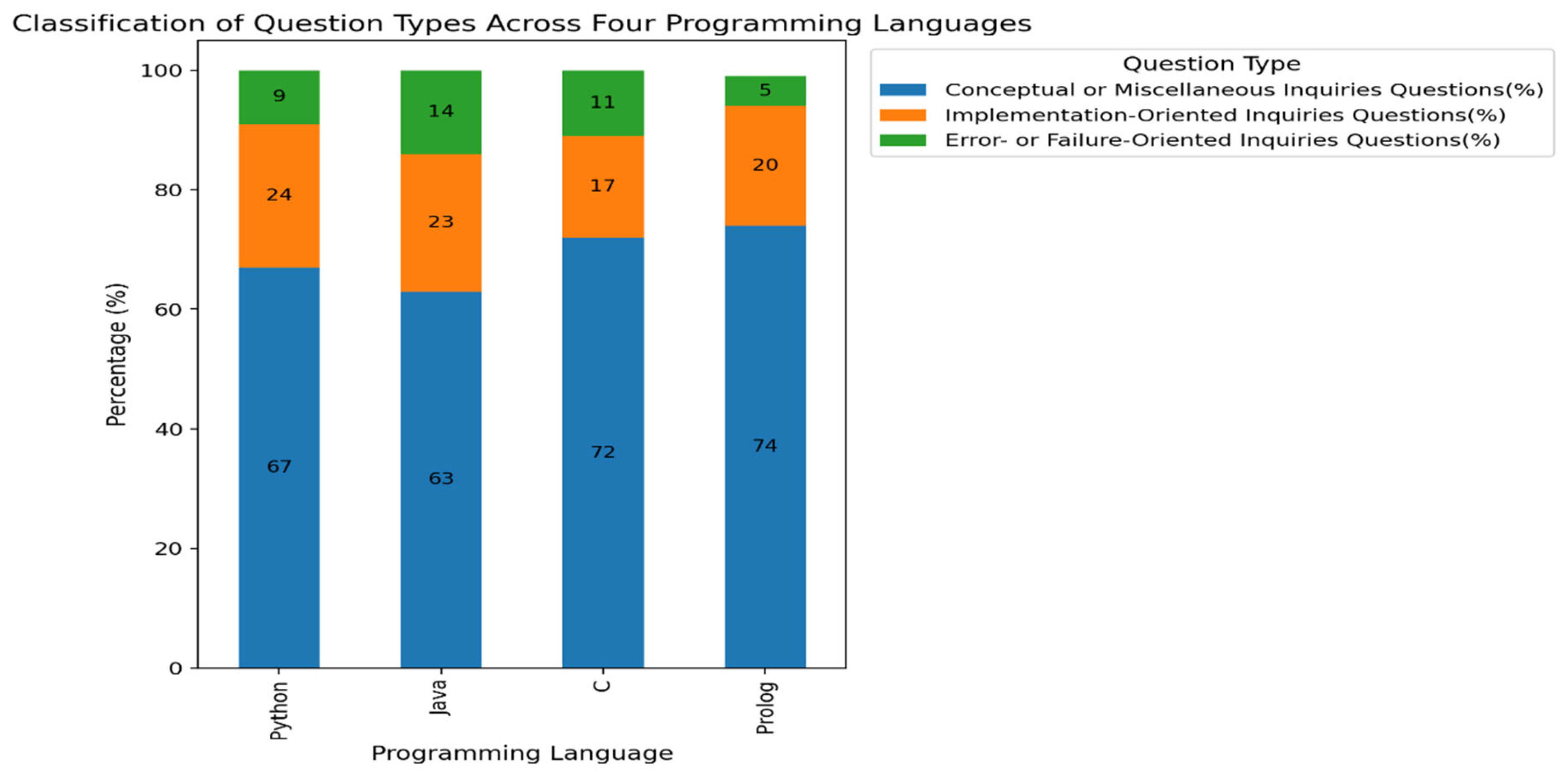 Figure 7 presents a comparison of question types on Stack Overflow question data across the four programming languages. Questions were categorized into three inquiry types: Implementation-Oriented, Error- or Failure-Oriented, and Conceptual/Miscellaneous Inquiries. Implementation-Oriented Inquiries refer to questions that focus on how to implement, apply, or use specific programming constructs, libraries, or techniques. These questions typically include procedural expressions such as “how to”, “how do I”, or “how can I”. Error- or Failure-Oriented Inquiries capture questions related to runtime errors, exceptions, unexpected program behavior, or system failures. These questions explicitly mention error messages, exceptions, crashes, or abnormal execution outcomes. Conceptual or Miscellaneous Inquiries include questions that do not fall into implementation- or error-focused categories, such as conceptual explanations, language comparisons, design considerations, performance discussions, or theoretical issues. The same criteria were applied consistently across all languages.