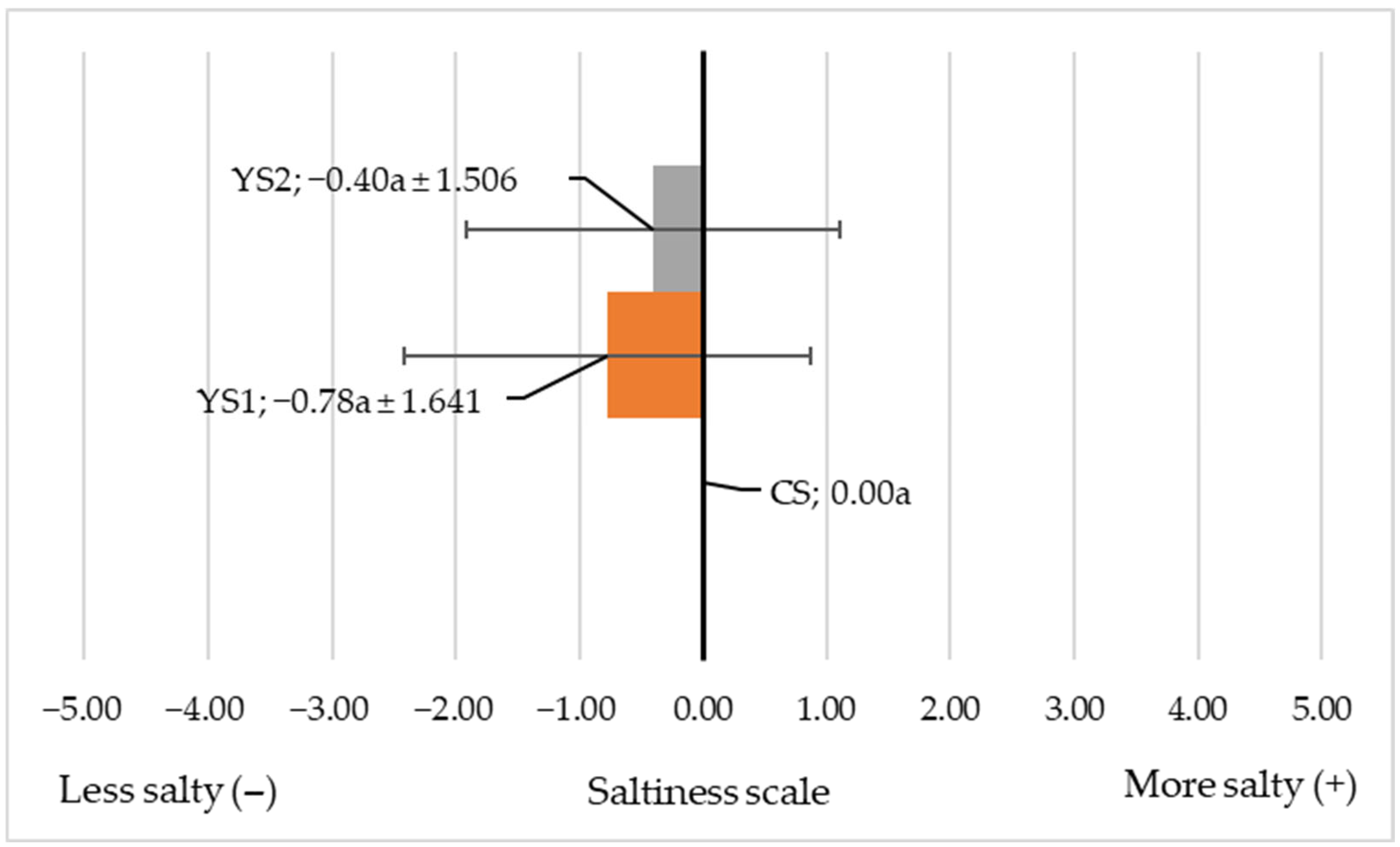 | CS (Control Sample) | YS1 (25% NaCl Reduction) | YS2 (50% NaCl Reduction) | |