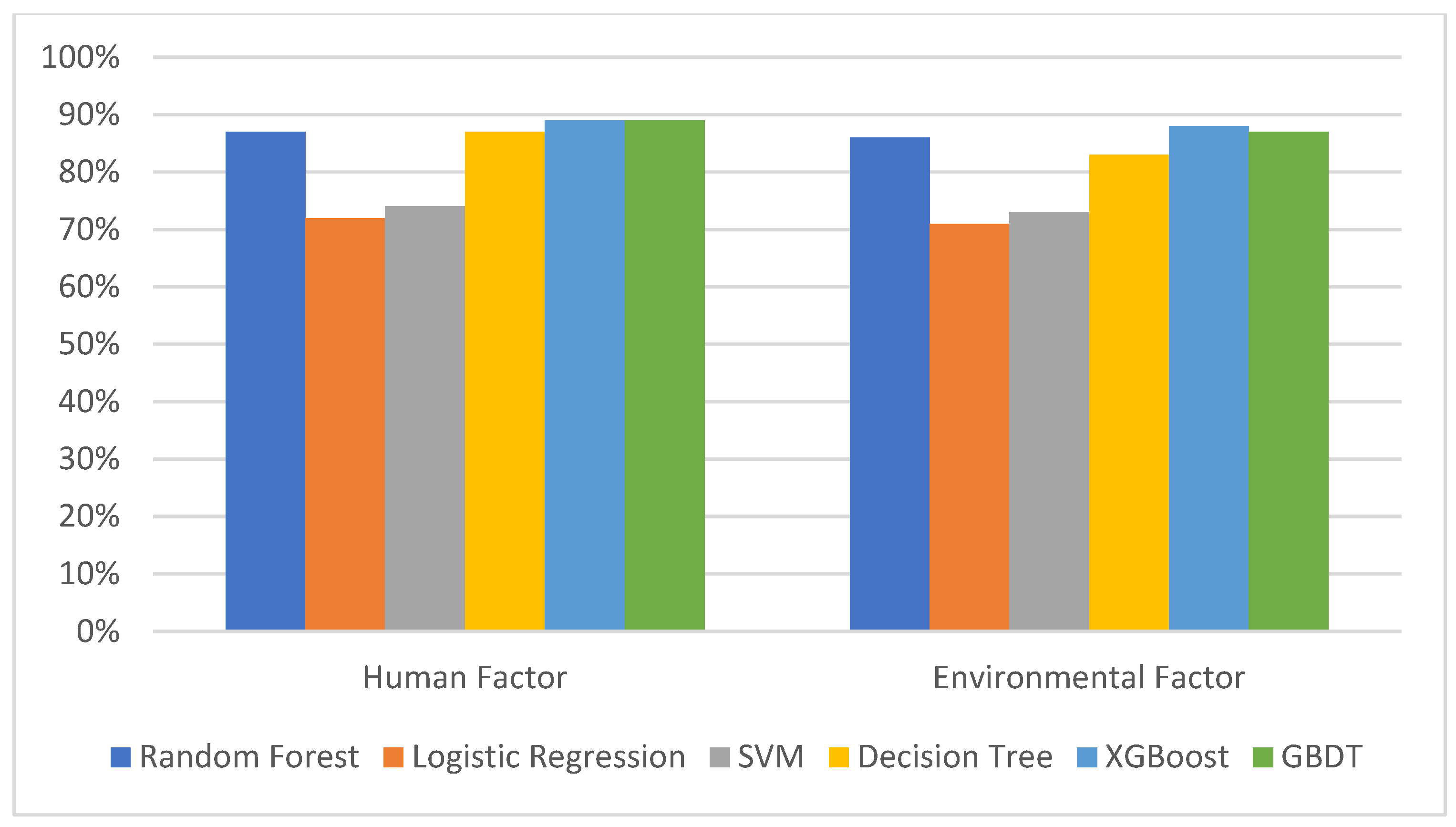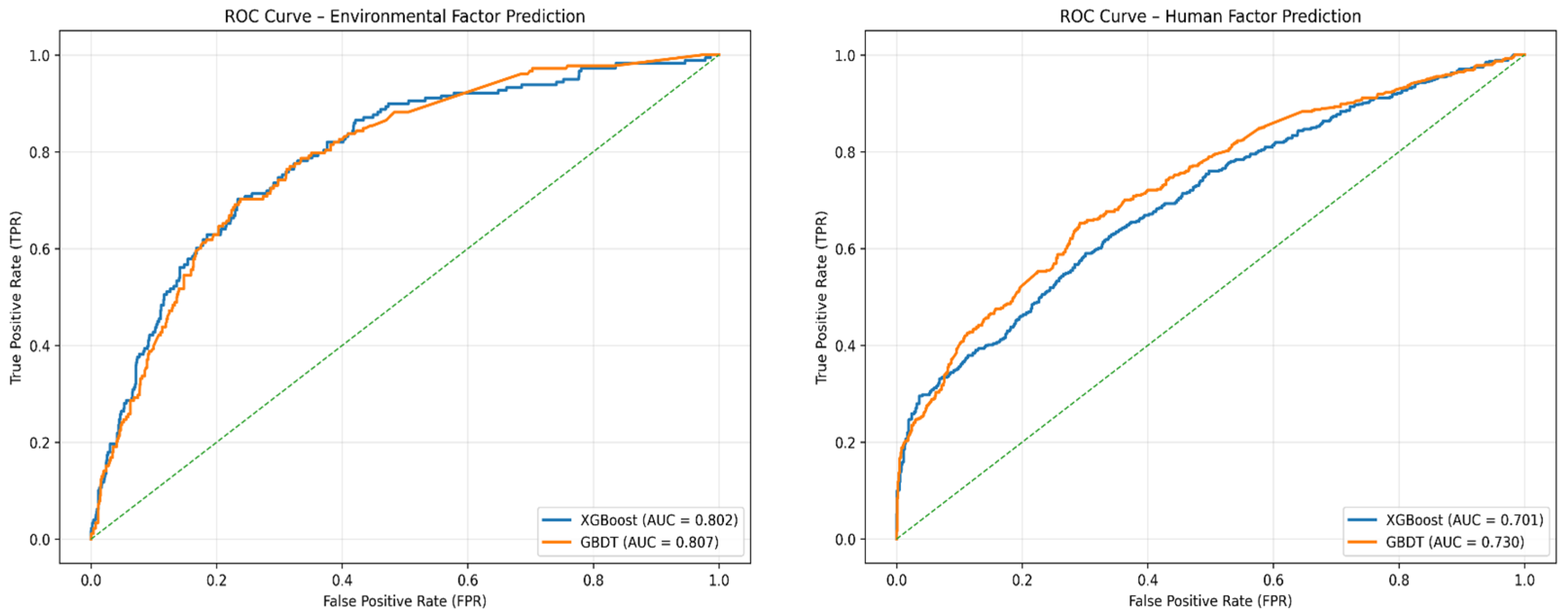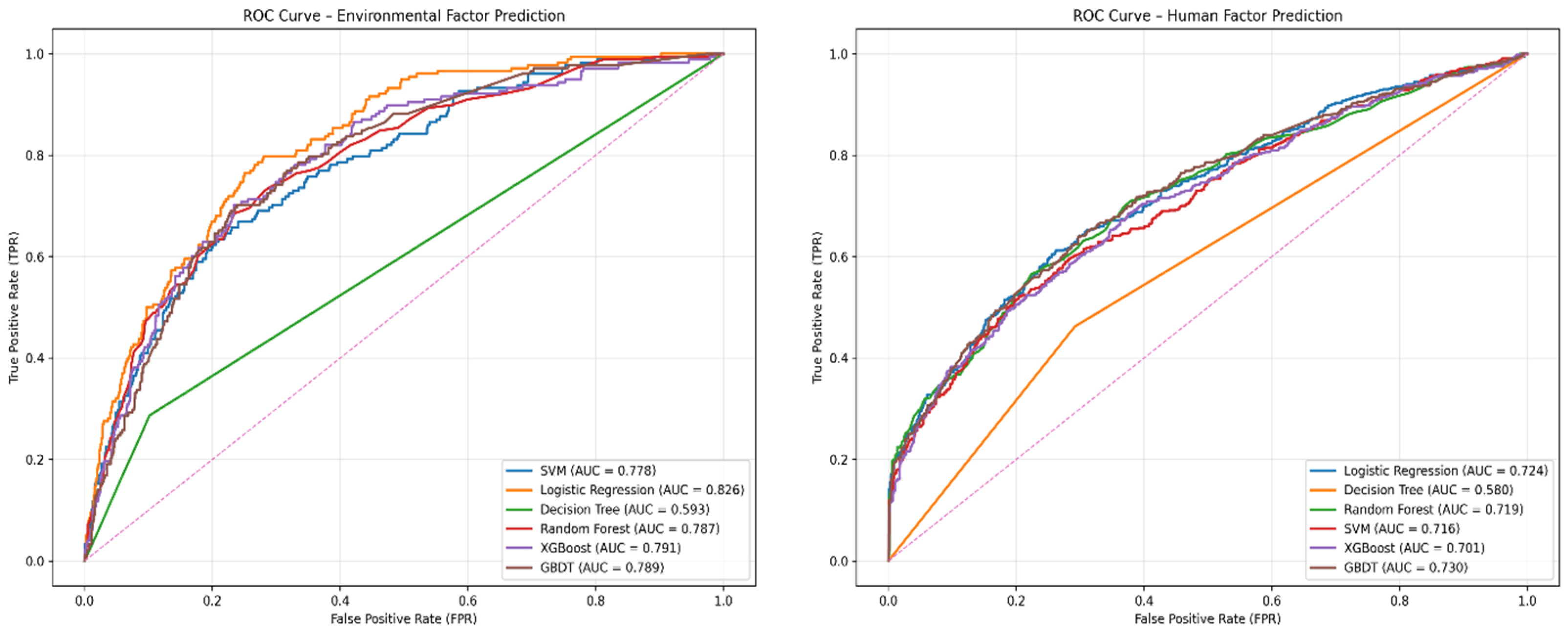The findings of this research validate the efficiency of machine learning to predict industrial accidents in terms of human and environmental factors. Of the tested models, gradient boosting-based algorithms (particularly XGBoost and GBDT) showed superior accuracy, precision, recall, and F1-score compared with conventional models like logistic regression, decision tree, and SVM. This superior performance could be attributed to their capability of modeling intricate nonlinear relationships of explanatory variables with accident occurrence, while controlling interactions among diverse risk factors.