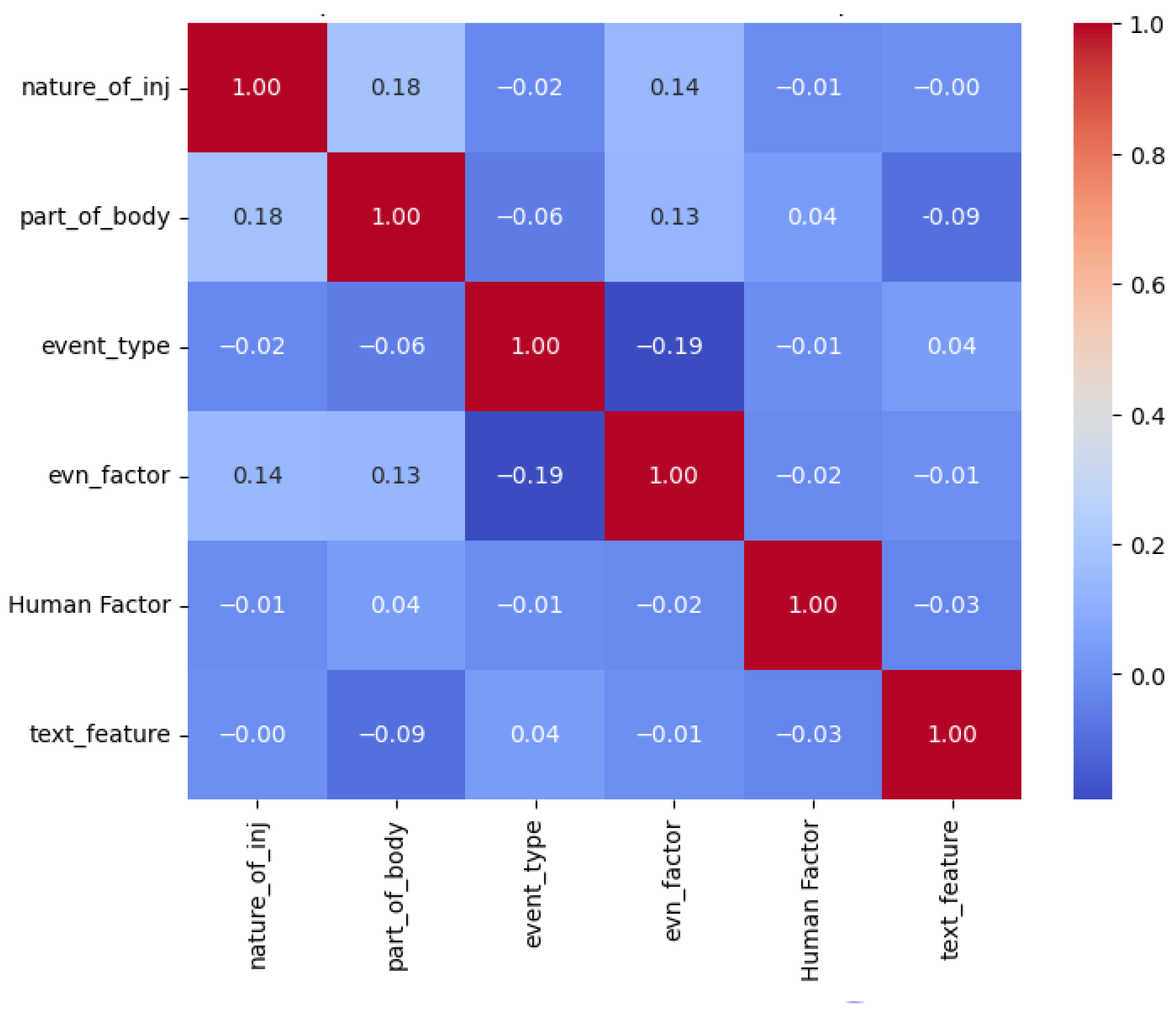 Categorical features were digitized in a manner consistent with the characteristics of the variables themselves prior to model training. The binary outcome variable, “Degree of Injury”, was defined as 1 for fatal accidents and 0 for non-fatal ones. Other categorical variables, such as “Part of Body”, “Accident Type”, “Nature of Injury”, as well as human and environmental factors, were converted into labels and assigned unique integer codes to ensure computational compatibility while preserving data brevity for nominal fields.