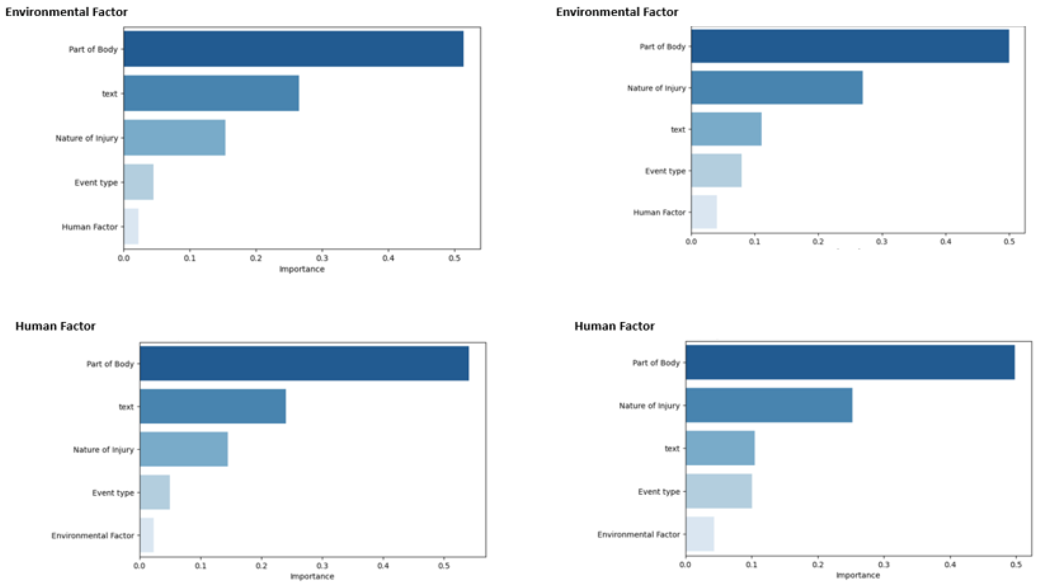 4] were among the first to apply ensemble learning methods to predict injury severity and affected body parts from construction accident reports. These studies established the feasibility of data-driven approaches for occupational accident analysis, which later research expanded using larger datasets and more advanced algorithms.