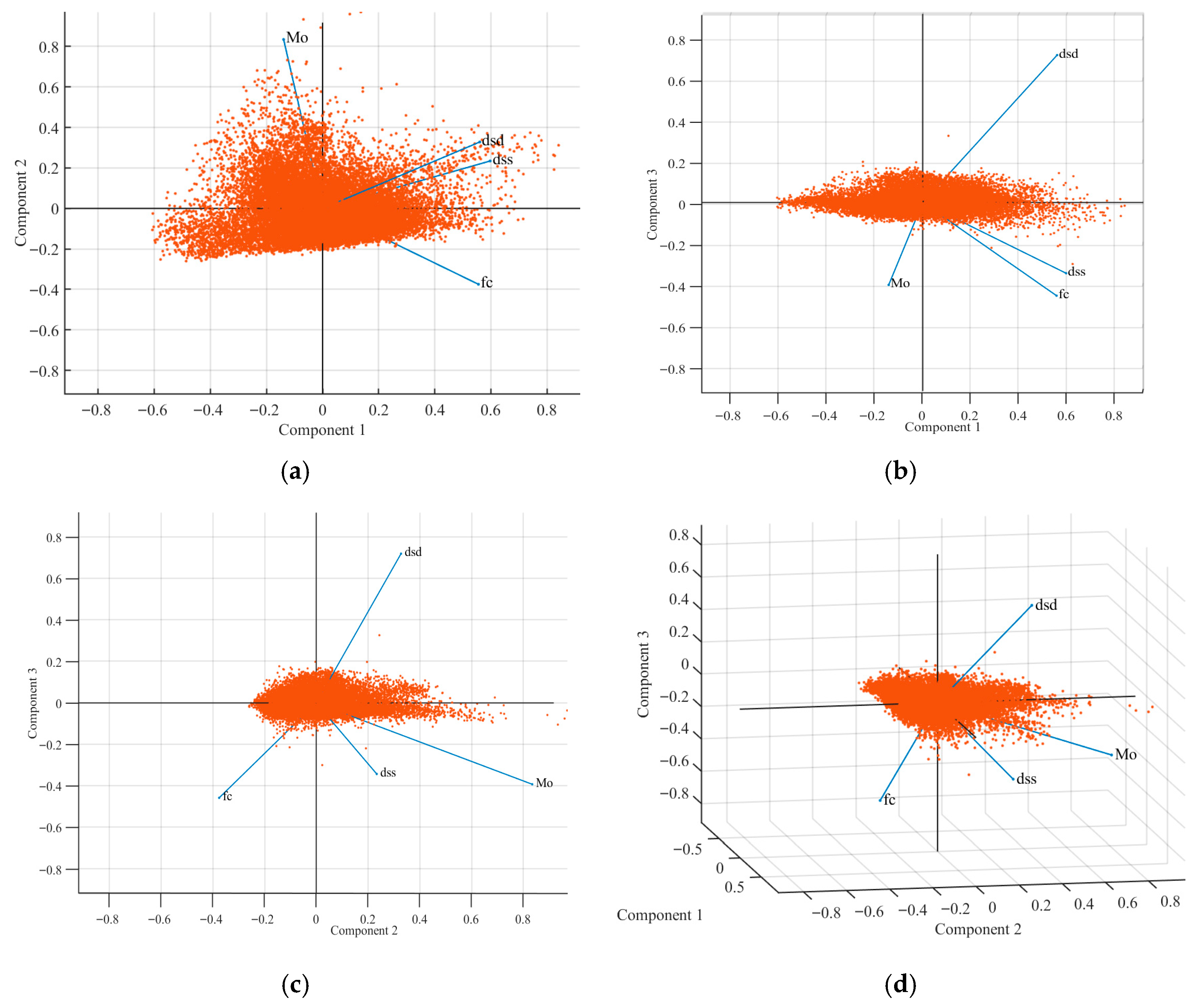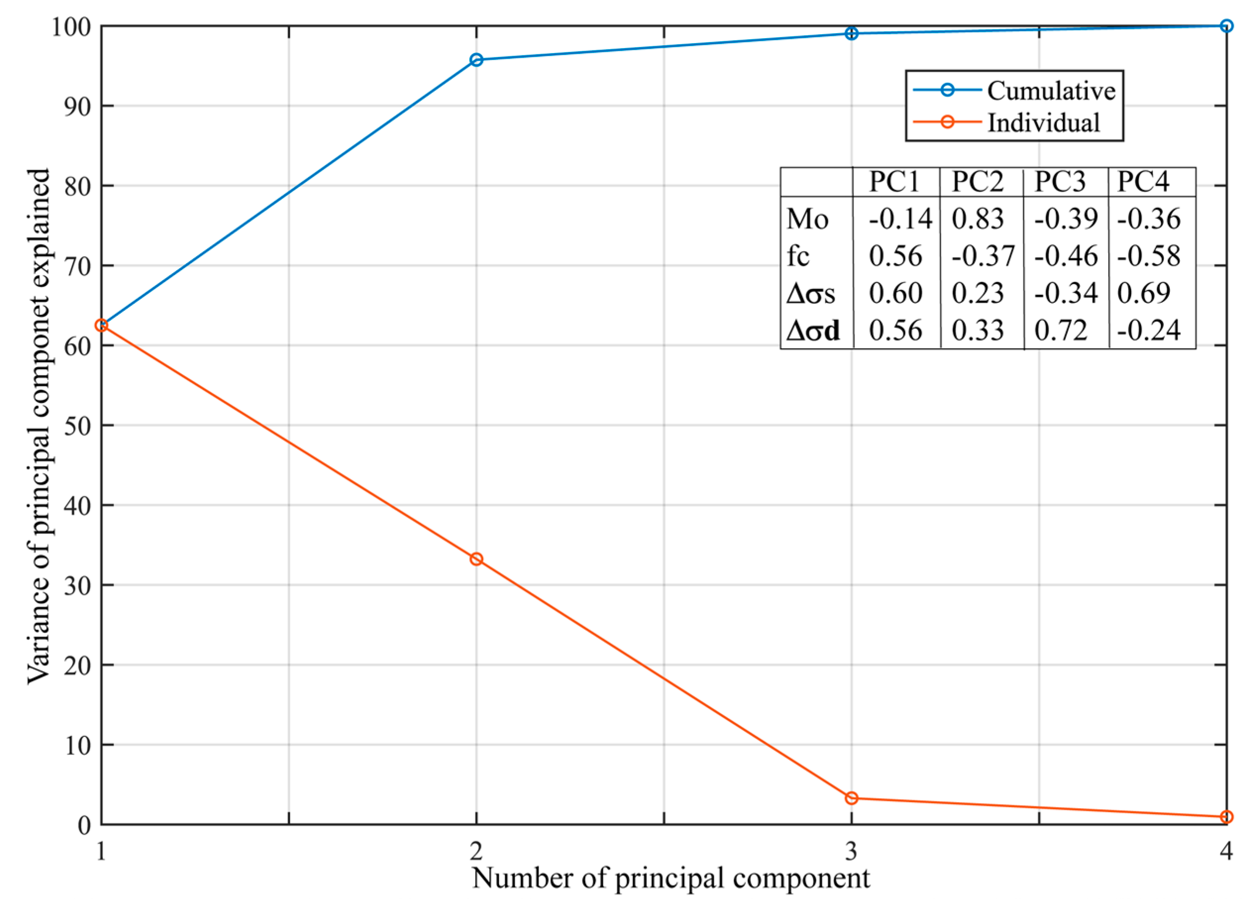 - The sign indeterminacy inherent to PCA, which captures both shared variance and contrasting patterns between correlated variables. Consequently, the opposite orientations reflect how PCA defines the direction of maximum variance within the stress domain rather than a physical contradiction between the parameters.