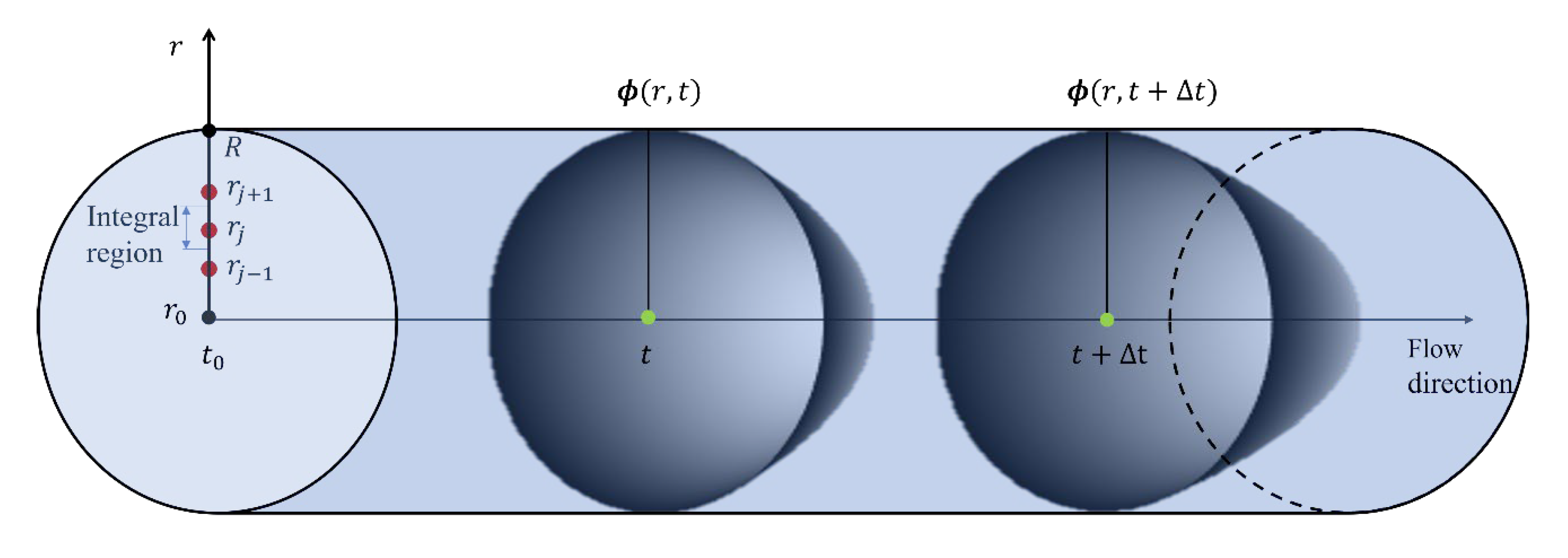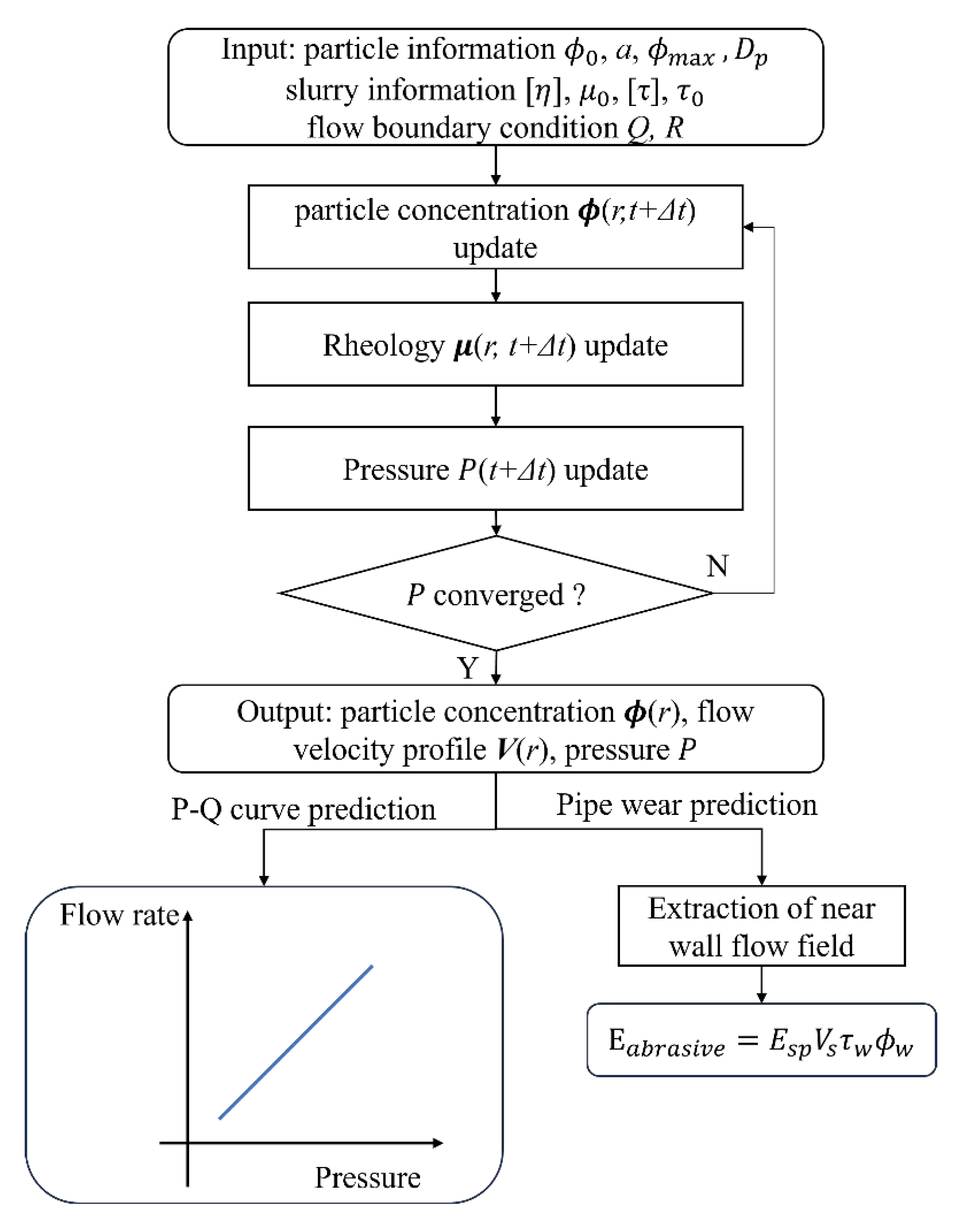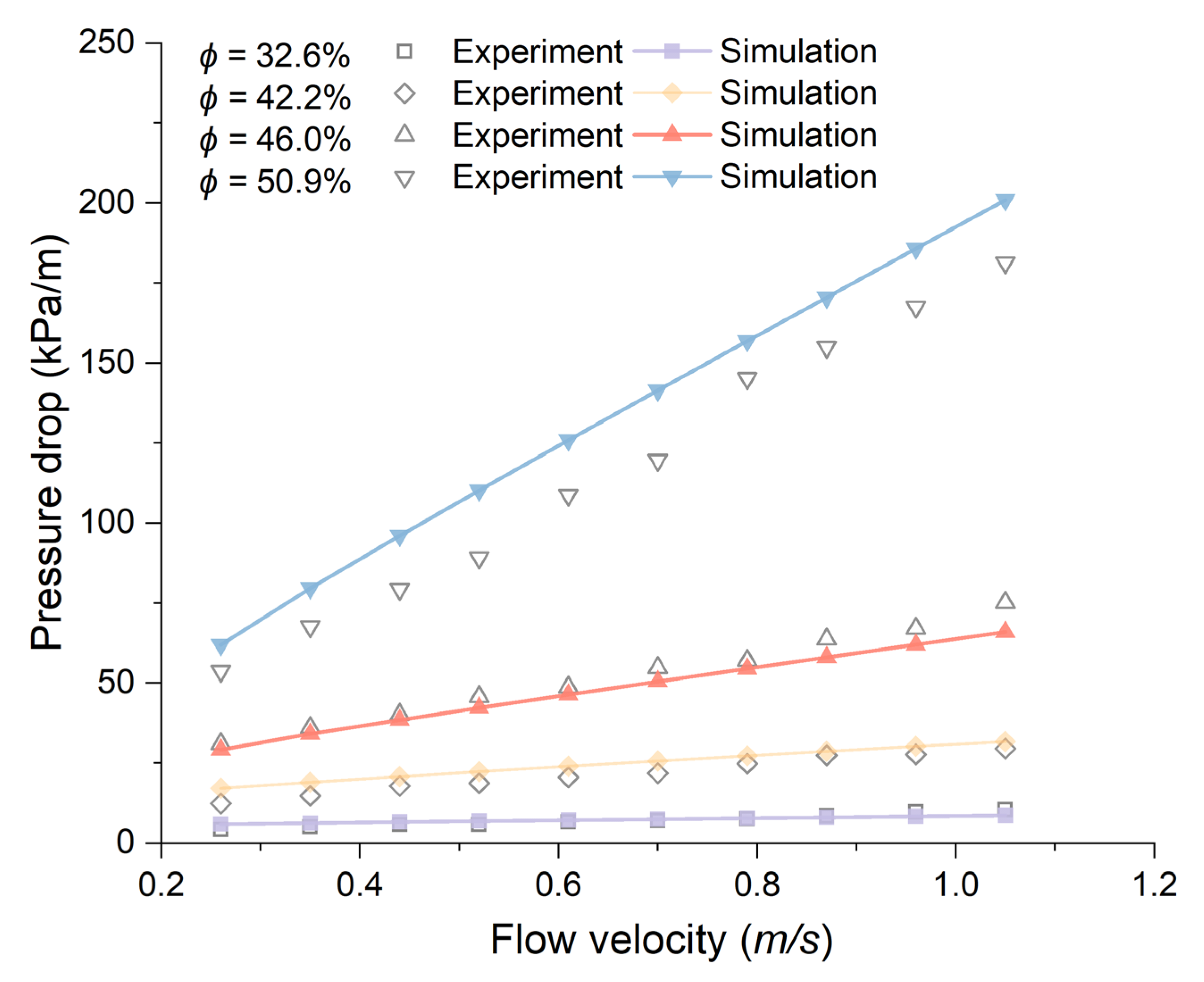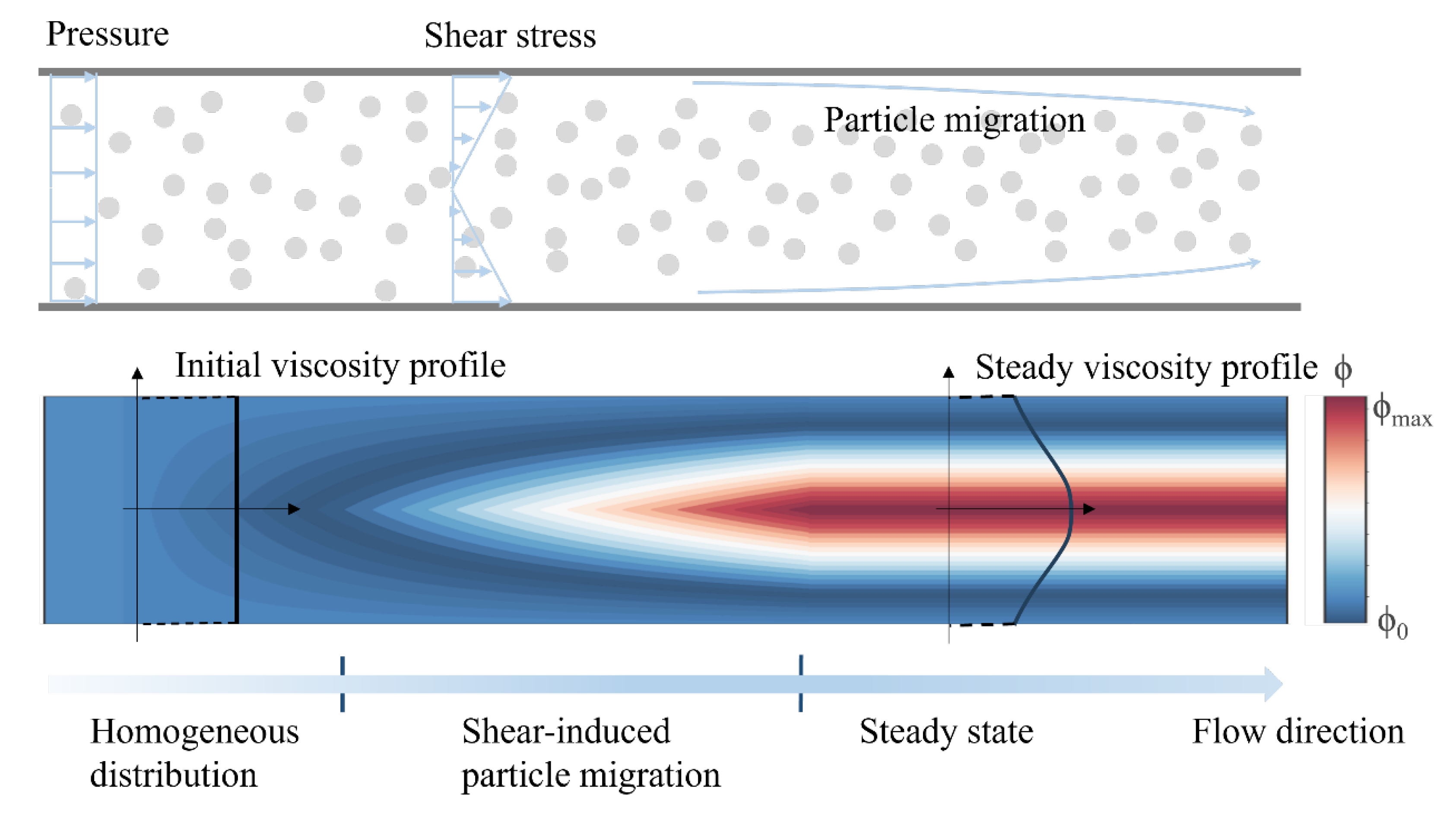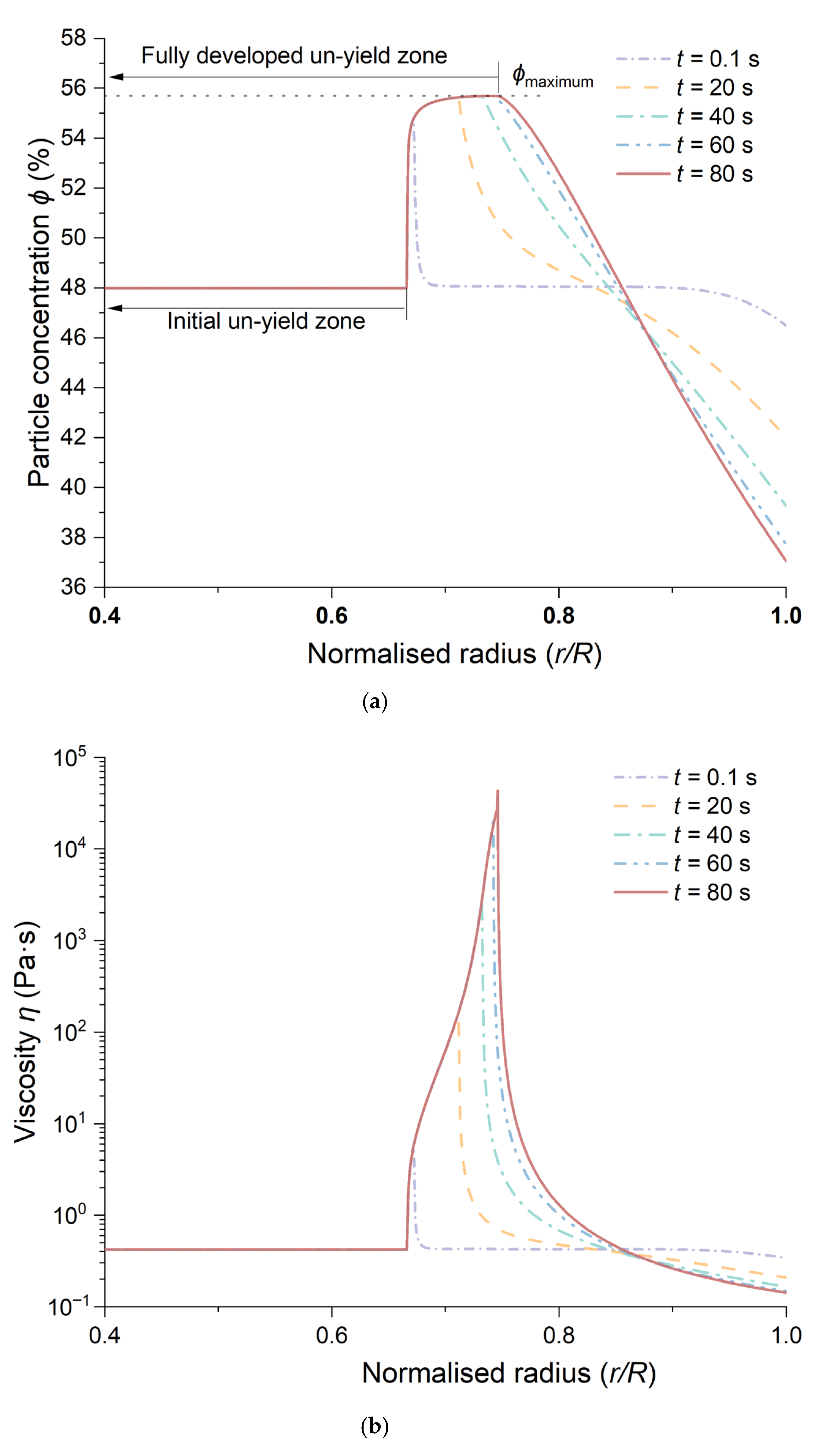 - Under constant flow conditions, particle migration from the pipe wall toward the unyielded boundary leads to heterogeneous particle distributions and spatially varying rheological properties. Elevated particle concentrations near the unyielded boundary increase the local viscosity to 10−5 Pa⋅s, thereby extending the unyielded zone. Conversely, the reduction in local viscosity near the pipe wall decreases flow resistance and reduces the overall pressure drop by up to 20%.