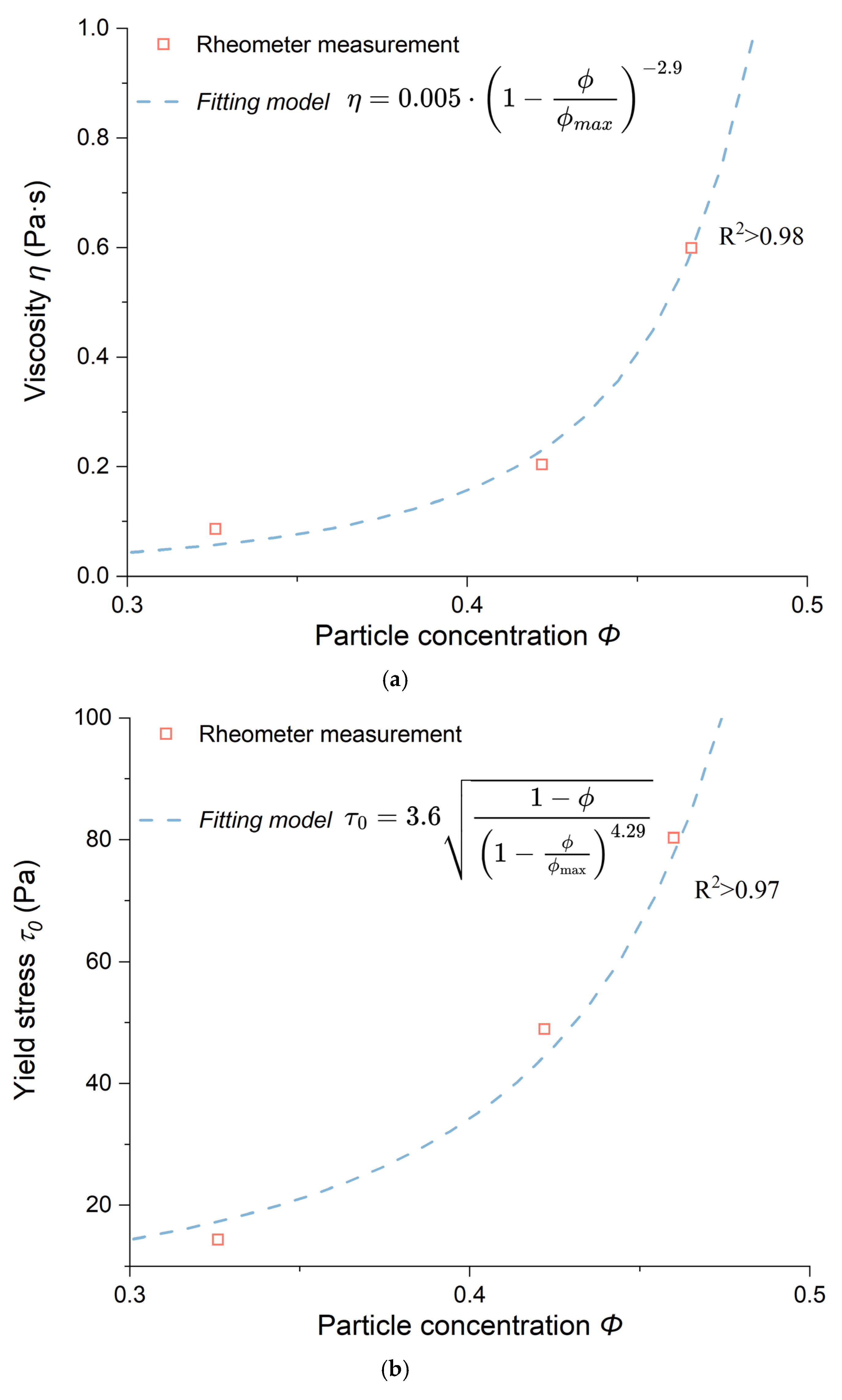 - Krieger, I.M.; Dougherty, T.J. A mechanism for non-Newtonian flow in suspensions of rigid spheres. Trans. Soc. Rheol. 1959, 3, 137–152. [Google Scholar] [CrossRef]
